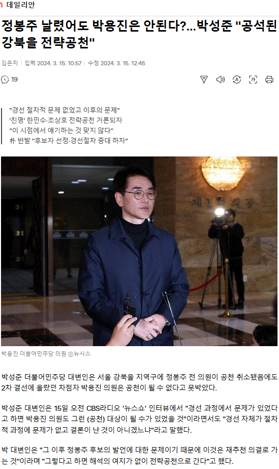정봉주 날렸어도 박용진은 안된다?…박성준 "공석된 강북을 전략공천"