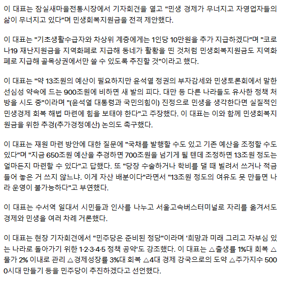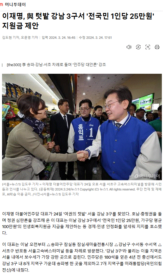 이재명, 與 텃밭 강남 3구서 '전국민 1인당 25만원' 지원금 제안