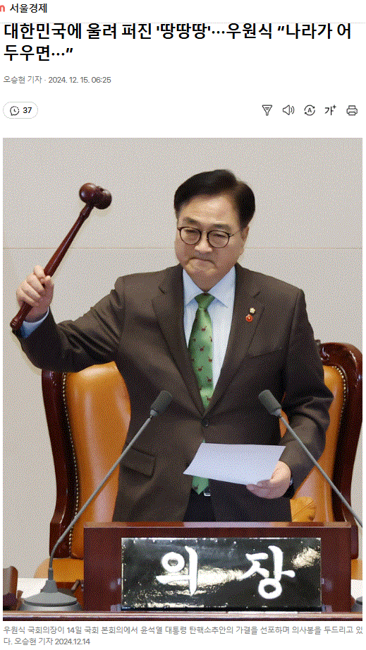 대한민국에 울려 퍼진 '땅땅땅'··· 우원식 “나라가 어두우면···”