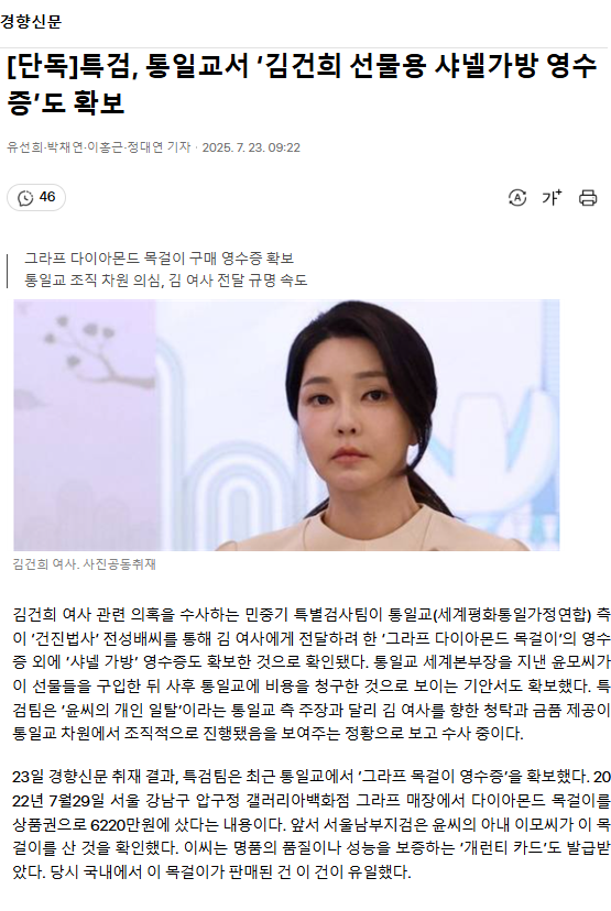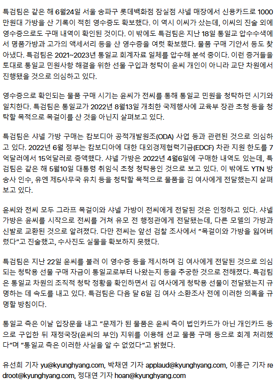 [단독] 특검, 통일교서 ‘김건희 선물용 샤넬가방 영수증’도 확보