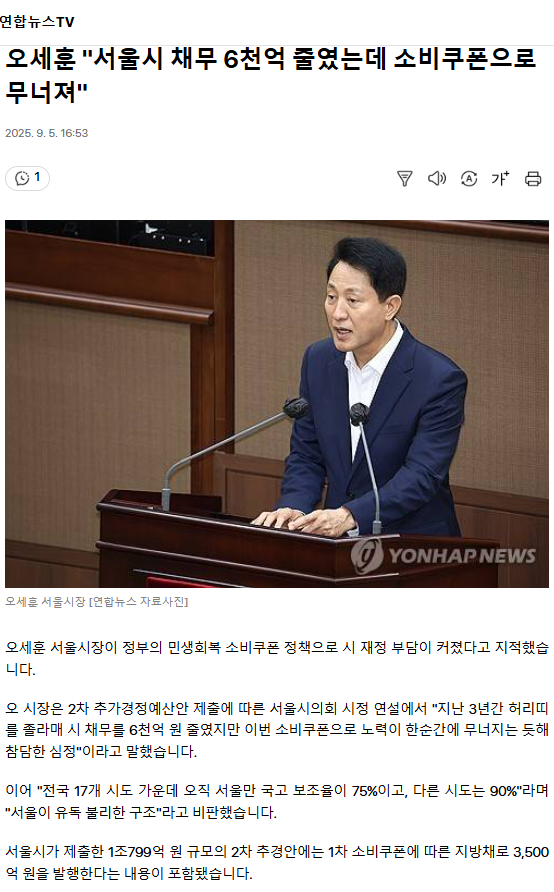 오세훈 "서울시 채무 6천억 줄였는데 소비쿠폰으로 무너져" ㅡ 6천억 줄인 증거를 내라