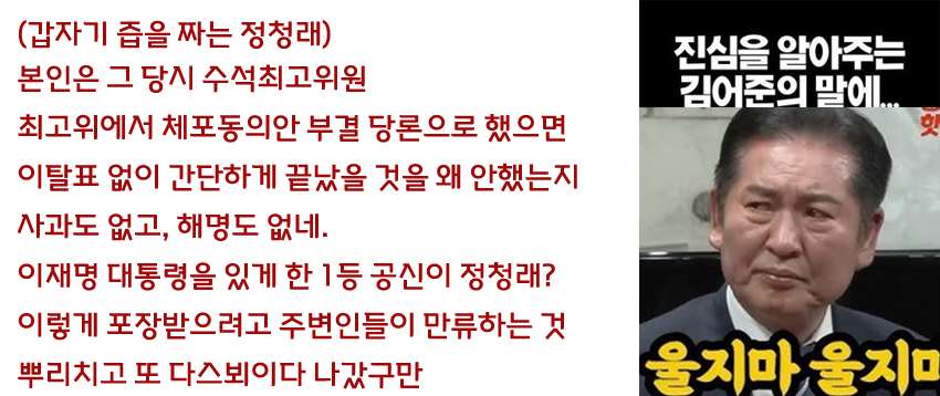 국힘 위장가입자라니. 본인은 그렇게 논리가 없어요. 정청래한테 뭐라 그러기만 하면 발작을 하네. 정성호는 그만두라고 하고.