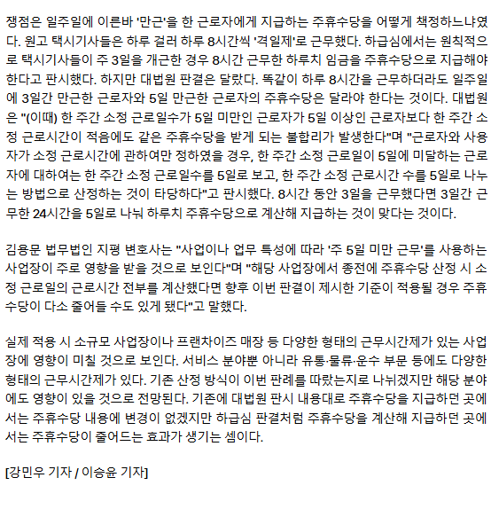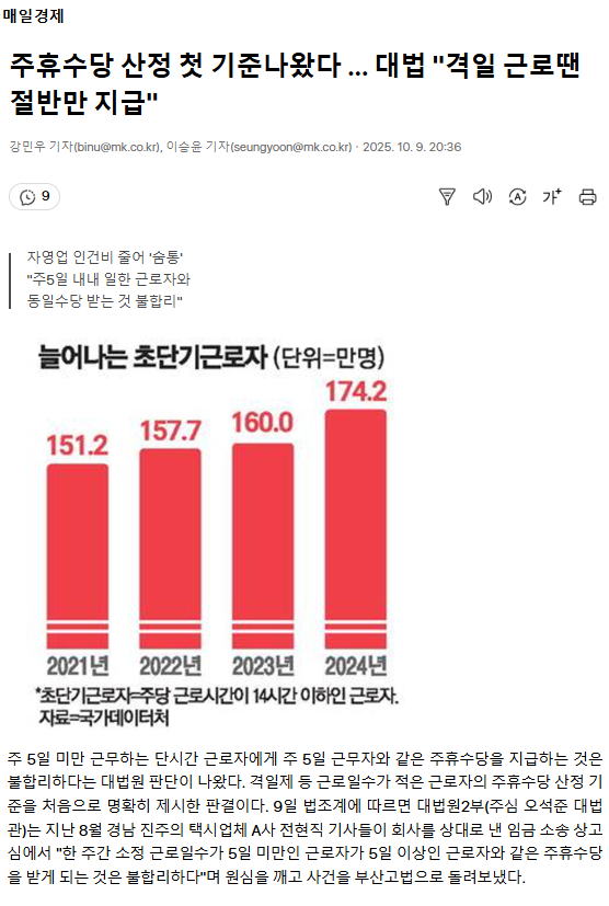 주휴수당 산정 첫 기준나왔다 … 대법 "격일 근로땐 절반만 지급"
