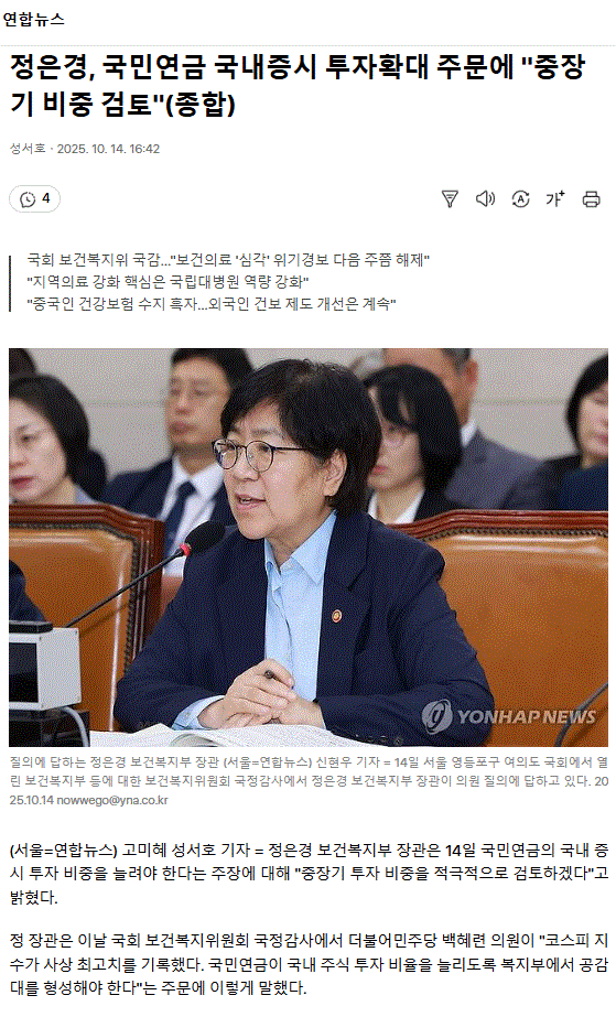 정은경, 국민연금 국내증시 투자확대 주문에 "중장기 비중 검토"