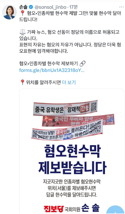 맞불 현수막 달기 : 혐오현수막 신고 받아 맞불 현수막 달아 준다는 진보당 따라 하기