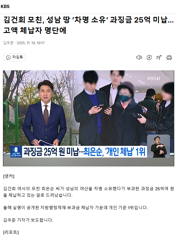 김건희 모친, 성남 땅 ‘차명 소유’ 과징금 25억 미납…고액 체납자 명단에 ㅡ 1위 체납자