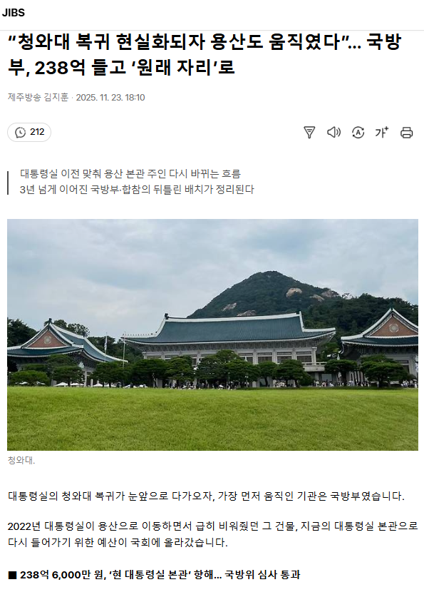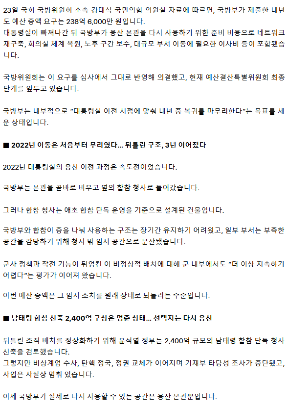 “청와대 복귀 현실화되자 용산도 움직였다”… 국방부, 238억 들고 ‘원래 자리’로