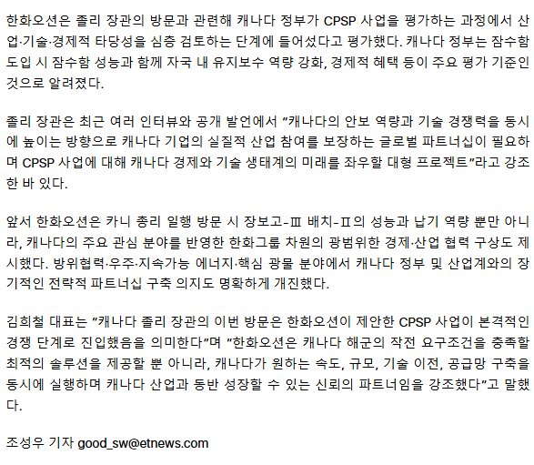 캐나다 총리 이어 장관까지 한화오션 방문… 잠수함 건조 역량 확인