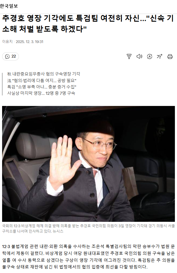 추경호 영장 기각에도 특검팀 여전히 자신... "신속 기소해 처벌 받도록 하겠다"