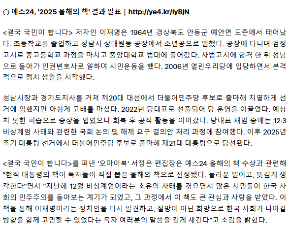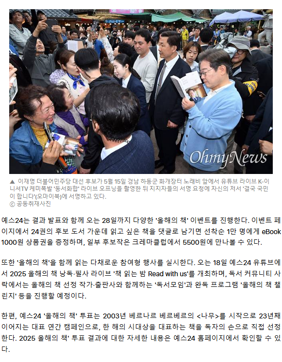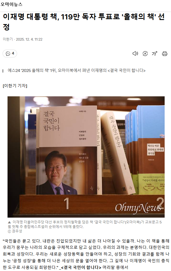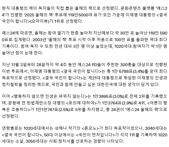 이재명 대통령 책, 119만 독자 투표로 '올해의 책' 선정