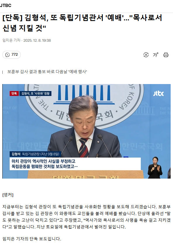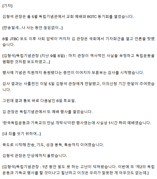 [단독] 김형석, 또 독립기념관서 '예배'… "목사로서 신념 지킬 것"ㅡ 김형석은 사퇴하고 신념 지켜라