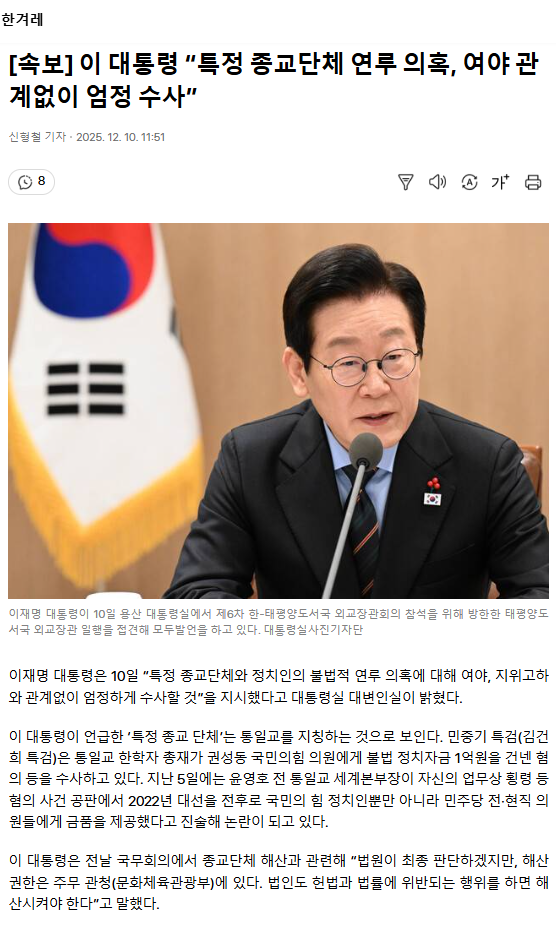[속보] 이 대통령 “특정 종교단체 연루 의혹, 여야 관계없이 엄정 수사”ㅡ 김건희 특검