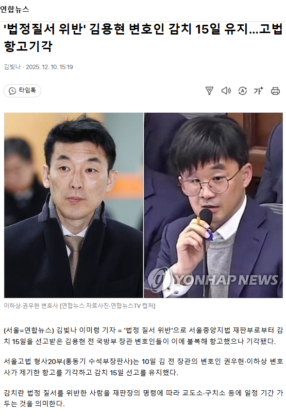 '법정질서 위반' 김용현 변호인 감치 15일 유지… 법 항고기각 ㅡ 이하상, 권우현 변호사 박탈
