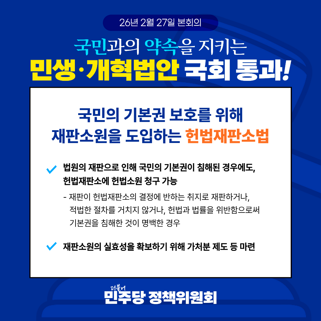 백승아 원내대변인 서면브리핑 ■ 재판소원제 국회 통과, 국민의 기본권 보장을 위한 역사적 진전입니다 오늘 국회 본회의에서 사법 3대 개혁안 중 하나인 재판소원법이 통과되었습니다. 이는 사법 정의를 바로 세우고, 국민의 기본권 보장 체계를 한층 더 두텁게 마련한 역사적 진전입니다. 재판소원제는 법원의 재판이 헌법과 법률에서 정한 적법절차를 위반하거나 국민의 기본권을 침해한 경우, 헌법재판소에 헌법소원을 청구하는 제도입니다. 이는 헌법적 판단을 통해 기본권 보장의 사각지대를 해소하기 위한 최소한의 안전장치입니다. 오래전부터 법조계와 학계에서는 그 필요성이 꾸준히 제기되어 왔습니다. 헌법재판소 역시 4심제가 아니라는 점을 분명히 하며, 합헌 취지의 판단을 여러 차례 밝혀왔습니다. 이는 사법부를 침해하는 것이 아니라, 오히려 재판의 정당성과 국민적 신뢰를 더욱 강화하기 위한 장치입니다. 사법부는 제도의 취지가 온전히 실현될 수 있도록 충실한 시행 방안을 마련해야 합니다. 국민의힘 역시 국민 기본권 보장이라는 시대적 과제 앞에서 정쟁을 멈추고 책임 있게 동참해야 합니다. 더불어민주당은 억울한 판결로 고통받는 국민이 없도록 사법 정의를 굳건히 세워 나가겠습니다. 헌법의 가치와 국민의 기본권이 더욱 두텁게 보장될 수 있도록 시대적 변화와 요구에 맞게 책임을 다하겠습니다. 2026년 2월 27일더불어민주당 공보국