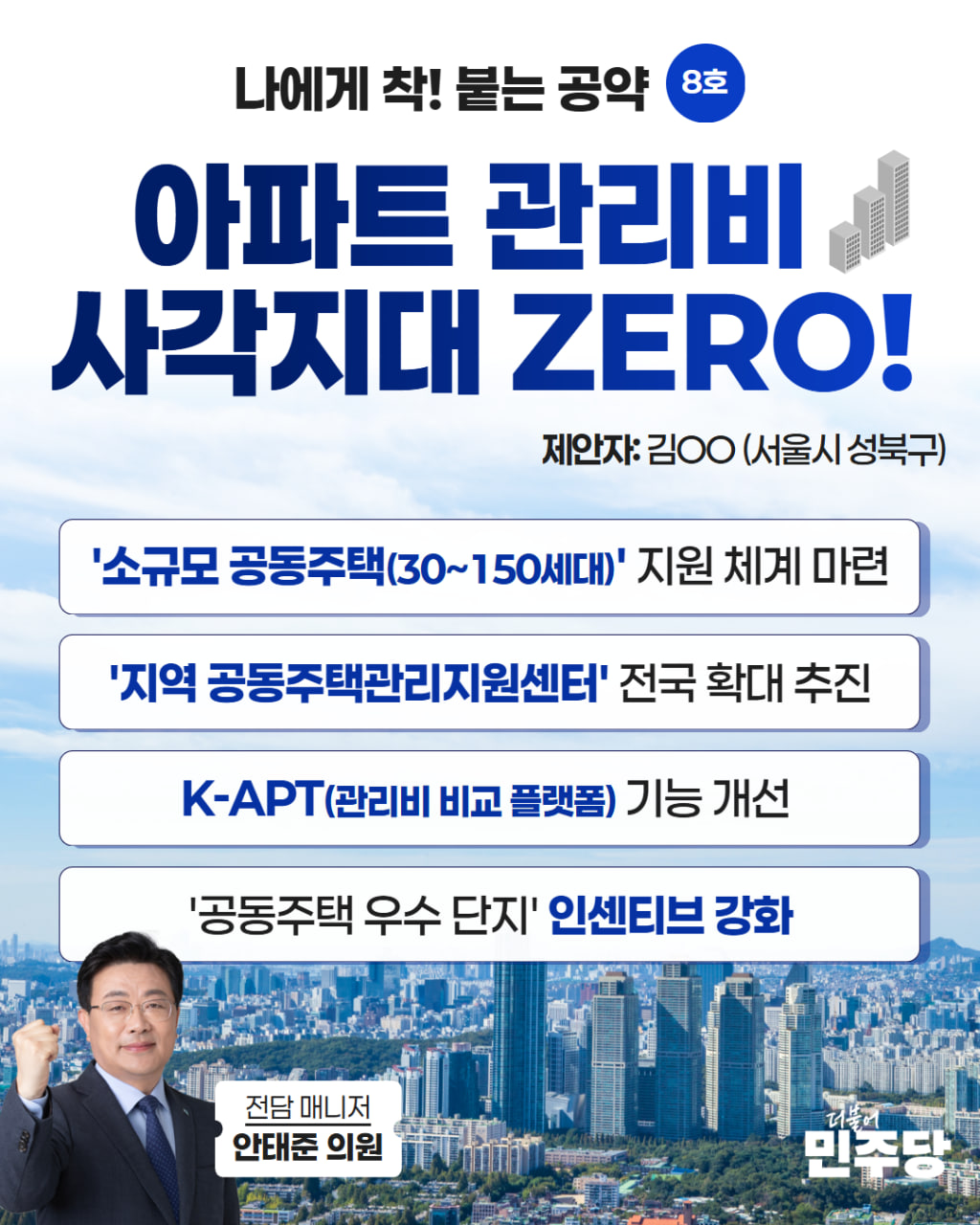 정청래 당대표, <착!붙 공약 프로젝트> 8호·9호 공약 발표 인사말 □ 일시 : 2026년 4월 16일(목) 오전 11시 30분□ 장소 : 국회 본관 당대표회의실 ■ 정청래 당대표 더불어민주당이 야심 차게 준비한 ‘착!붙 공약 프로젝트’ 이번 6·3 지방선거에 최고의 히트 상품이 아닐까 생각합니다. 오늘은 8호, 9호 공약을 발표합니다. 제가 요즘 ‘현장 속으로, 국민 속으로’ 민생 체험 활동을 많이 하고 있는데요. 어제는 부산 기장군에서 미역 건조 체험을 하고 왔습니다. 역시 현장에 갈 때마다 현장의 어려운 목소리를 많이 듣게 됩니다. 하나하나 다 귀담아 들을 내용입니다. 거기에 앞서서 부산의 큰 전통시장인 부전시장에 다녀왔는데 마포구 망원시장에 온 것 같은 느낌이었습니다. 정말 깜짝 놀랐습니다. 제가 악수하려고 내미는 횟수보다 저에게 손을 내밀고 악수하자고 하는 부산 시민들이 훨씬 많았습니다. 제가 정치 활동하면서 부산에 20여 년 다녀봤는데 처음 느껴보는 열광적인 환영 분위기였습니다. 물론 저보다도 전재수 후보가 있었기 때문에 그러리라고 생각은 하지만, 그래도 확실히 부산에도 파란 바람이 거세게 불기 시작했구나 하는 것을 몸으로 실감할 수 있었습니다. 이것이 하나의 요인일 수는 없지만 역시 이재명 대통령께서 너무 정치를 잘 하시고 서민들의 아픔을 실증적으로 정말 디테일하게 잘 알고 계신다는 부분에 대한 평가 그리고 제가 작년 연말에 부산에 갔을 때 들은 얘기인데 부산 시민의 진짜 얘기입니다. "대표님, 진짜 해수부가 오네요. 이렇게 빨리 올 줄 몰랐어요." 그런 얘기를 실제로 하더라고요. 그래서 보통 정치권에서 무슨 공약을 얘기하고 그러면 '되겠어? 말인 거 아니야?' 이런 느낌이었을 텐데, “아니 해양수산부가 실제로 연내에 와요.” 너무나 놀라더라고요. 그러면서 하는 얘기가 요즘 해수부 근처의 식당들이 그렇게 손님들이 넘쳐난답니다. 눈으로 보는 거죠. ‘해수부가 오니까 이런 효과가 있구나.’ 근데 어제 전재수 의원 얘기 들어보니까 대학 경쟁률도 높아지고 해양 관련 학과가 엄청난 인기라는 거예요. 그런 기대치가 많이 반영이 되고 있지 않나 생각합니다. 부산 시민들의 이재명 정부에 대한 기대 열망이 아마도 이번 지방선거에서 전국적으로 확산 되지 않을까 그런 생각이 듭니다. 제가 강원도에 가서 우리 기자분들께서 한 마디 코멘트를 하라고 해서 제가 사실 준비하고 간 멘트는 아닙니다. 근데 강원도 그러면 높새바람 이런 생각이 들지 않습니까? 옛날에 우리 학교 다닐 때 배운 높새바람. 그 높새바람을 얘기하다가 순간 강원도에도 높새바람뿐만 아니라 파란 바람이 불고 있는 거 아니냐는 생각이 번뜩 들어서 제가 파란 바람 얘기를 꺼냈습니다. 실제로 강원도 현장을 다녀보니까 진짜로 파란 바람이 불고 있었습니다. 그런데 어제 부산에 가니까 부산에도 파란 바람이 상륙해 있었습니다. 어느 카페에 앉아 있던 손님들이 저를 보자마자 사진 찍자는 것을 보면서 부산이 확실히 파란 바람이 강하게 불 조짐을 보이고 있다는 생각이 들었습니다. 그래서 이번 6·3 지방선거에서 우리 더불어민주당이 4무·4강 공천을 통해서 역대급으로 공천이 원활하고 잡음과 분란이 언론 보도에 거의 없지 않습니까? 그런 것부터 시작해서 4무·4강 공천뿐만 아니라 그것을 든든하게 뒷받침하고 있는 ‘착!붙 공약’ 시리즈 발표도 굉장히 저변으로부터 큰 효과를 불러오고 있다고 생각합니다. 그래서 이 착붙 공약을 앞으로 실무적으로 진두지휘하게 될 우리 이소영 의원한테 감사드리고, 총괄하고 있는 김태년 단장님 그리고 또 민병덕 총괄 매니저를 비롯한 여러분들께 당대표가 공개 칭찬합니다. 이건 굉장히 히트 상품입니다. 김태년 단장님 그리고 민병덕 총괄 매니저님, 이소영 간사님을 비롯한 잘하시는 분들에게는 즉석에서 저도 공약합니다. 여러분께 착 붙는 공약입니다. 당대표 표창을 기회를 봐서 하도록 하겠습니다. 착 붙습니까? 3대 개혁 특위는 지금 진행하고 있습니다. 그래서 착붙 공약팀도 당대표 표창을 하겠다는 말씀을 드립니다. 오늘 착붙 공약 8호는 아파트 관리비 절감 대책입니다. 정말 필요한 얘기입니다. 우리가 아파트 관리비 낼 때마다 비싼 건지 싼 건지, 우리가 혹시 바가지 쓰는 것은 아닌지 여러 궁금함이 있을 텐데, 그것을 실질화·효율화를 시켜서 아파트 관리비 절감 대책을 공약하는 것입니다. 두 번째, 오늘 발표할 9호 공약은 청년 신혼부부의 주거 사다리를 보호하기 위한 해법입니다. 착붙 공약을 발굴하고 이렇게 발표하기까지 우리 국민 여러분들께서 이 공약에 전 국민적으로 지금 참여해 주고 계십니다. 국민들께 감사드리고 오늘 김태년 단장님을 비롯한 착붙 공약팀에게 진심으로 감사드립니다. 오늘 아파트 관리비를 낼 때마다 고개를 갸우뚱했던 분들이 계시다면 저희 공약에 집중해 주시기 바랍니다. 감사합니다. 2026년 4월 16일더불어민주당 공보국