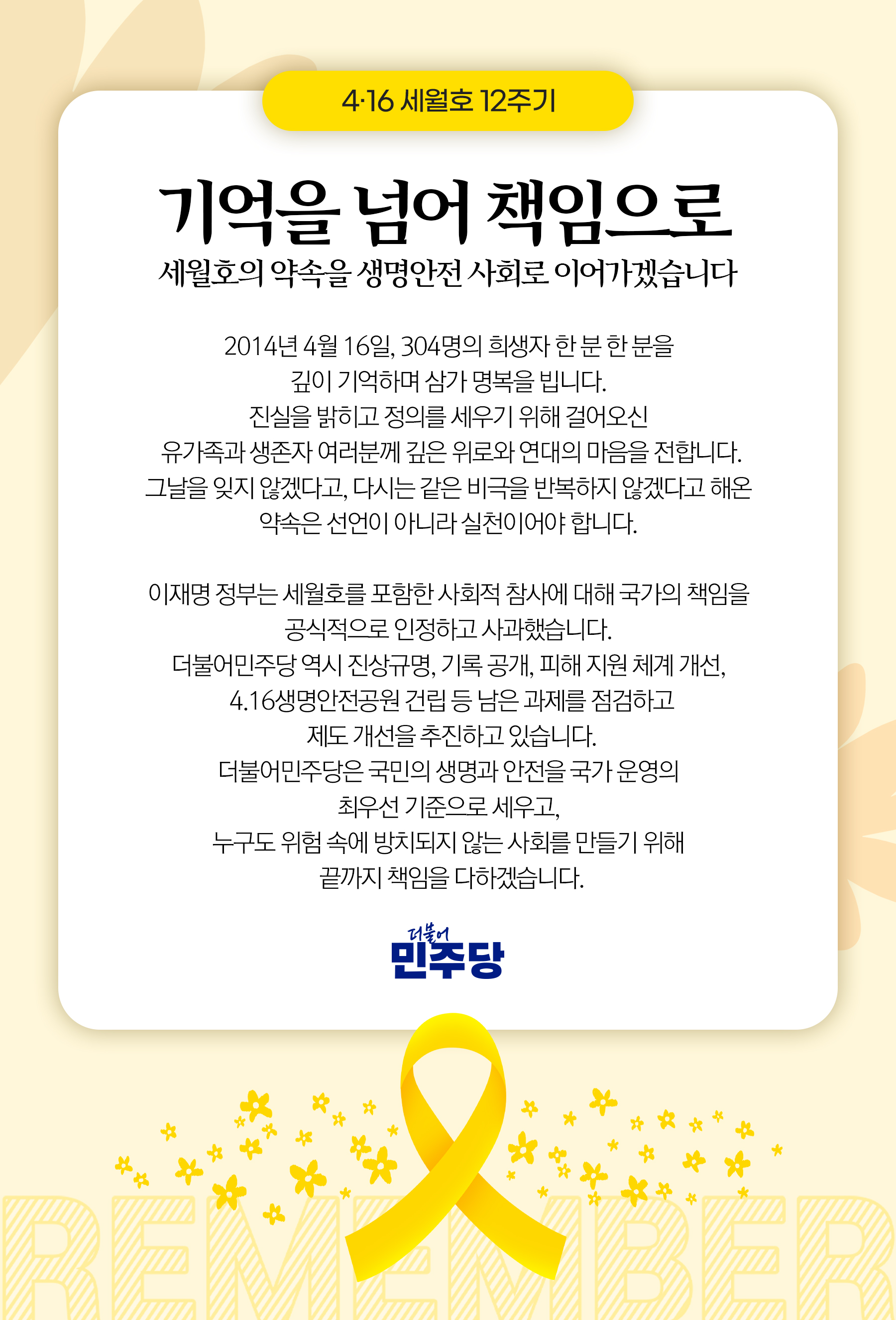 박해철 대변인 서면브리핑 ■ 기억을 넘어 책임으로, 세월호의 약속을 생명안전 사회로 이어가겠습니다 세월호 참사 12주기입니다. 2014년 4월 16일, 304명의 소중한 생명이 우리 곁을 떠났습니다. 국민의 생명을 지켜야 할 국가가 그 책임을 다하지 못했다는 사실은 지금도 우리에게 무거운 질문을 던지고 있습니다. 세월호 참사는 과거가 아니라, 국가의 존재 이유와 책임을 끊임없이 묻는 현재의 과제입니다. 희생자 한 분 한 분을 깊이 기억하며 삼가 명복을 빕니다. 헤아릴 수 없는 슬픔 속에서도 진실을 밝히고 정의를 세우기 위해 걸어오신 유가족과 생존자 여러분께 깊은 위로와 연대의 마음을 전합니다. 그분들의 고통과 용기가 있었기에 우리 사회는 멈추지 않고 여기까지 올 수 있었습니다. 세월호 참사 이후 우리는 그날을 잊지 않겠다고, 다시는 같은 비극을 반복하지 않겠다고 약속해 왔습니다. 이제 그 약속은 선언이 아니라 실천이어야 합니다. 국민의 생명과 안전을 최우선에 두는 국정 기조를 확립하고, 행정 전반의 가치와 기준을 바꾸는 것이 세월호 앞에서 우리가 져야 할 책임입니다. 이재명 정부는 세월호를 포함한 사회적 참사에 대해 국가의 책임을 공식적으로 인정하고 사과했습니다. 더불어민주당 역시 피해자 및 유가족, 시민사회와 함께 진상규명, 기록 공개, 2차 가해 방지, 피해 지원 체계 개선, 4.16생명안전공원 건립 등 남은 과제를 점검하고 제도 개선을 추진하고 있습니다. 세월호를 기억하는 일은 또 다른 참사를 막는 일입니다. 그날의 교훈이 제도와 현실 속에 실천으로 뿌리내릴 때 비로소 우리는 같은 비극을 반복하지 않을 수 있습니다. 조속히 생명안전기본법을 제정해 안전 사회로 한 걸음 더 나아가겠습니다. 더불어민주당은 국민의 생명과 안전을 국가 운영의 최우선 기준으로 세우고, 누구도 위험 속에 방치되지 않는 사회를 만들기 위해 끝까지 책임을 다하겠습니다. 다시 한 번 세월호 참사 희생자들의 명복을 빌며, 유가족과 생존자 여러분께 깊은 위로의 마음을 전합니다. 2026년 4월 16일더불어민주당 공보국