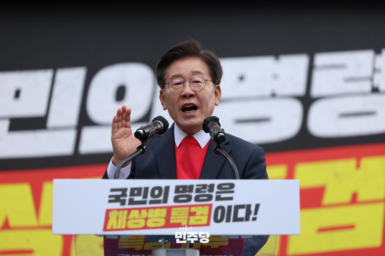 이재명 당대표가 2024.05.21.(화) 국회 본청 앞 계단에서 해병대원특검법 재의요구 규탄 야당·시민사회 공동기자회견을 하고 있다.