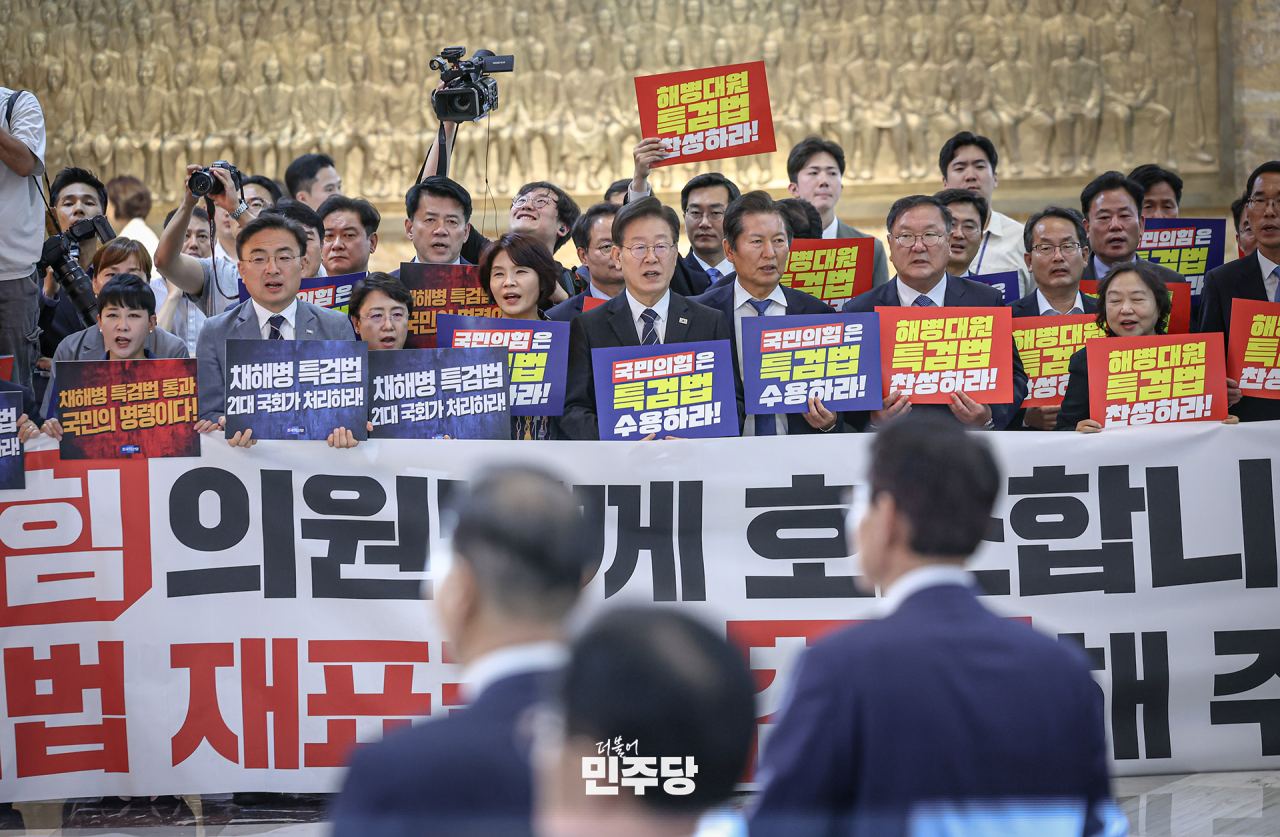 이재명 당대표가 2024.05.28.(화) 국회 본청 예결위의장에서 열린 의원총회에 참석하여 모두발언을 한 뒤 본회의에 입장하는 국민의힘 의원들을 향해 채해병 특검법 가결을 호소하고 있다.