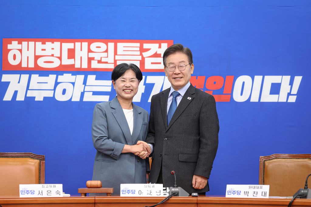 이재명 당대표가 2024.05.29.(수) 국회 본청 당대표회의실에서 열린 최고위원회의 참석하여 이 날을 마지막으로 최고위원직에서 사퇴하는 서은숙 최고위원과 기념촬영을 하고 있다.
