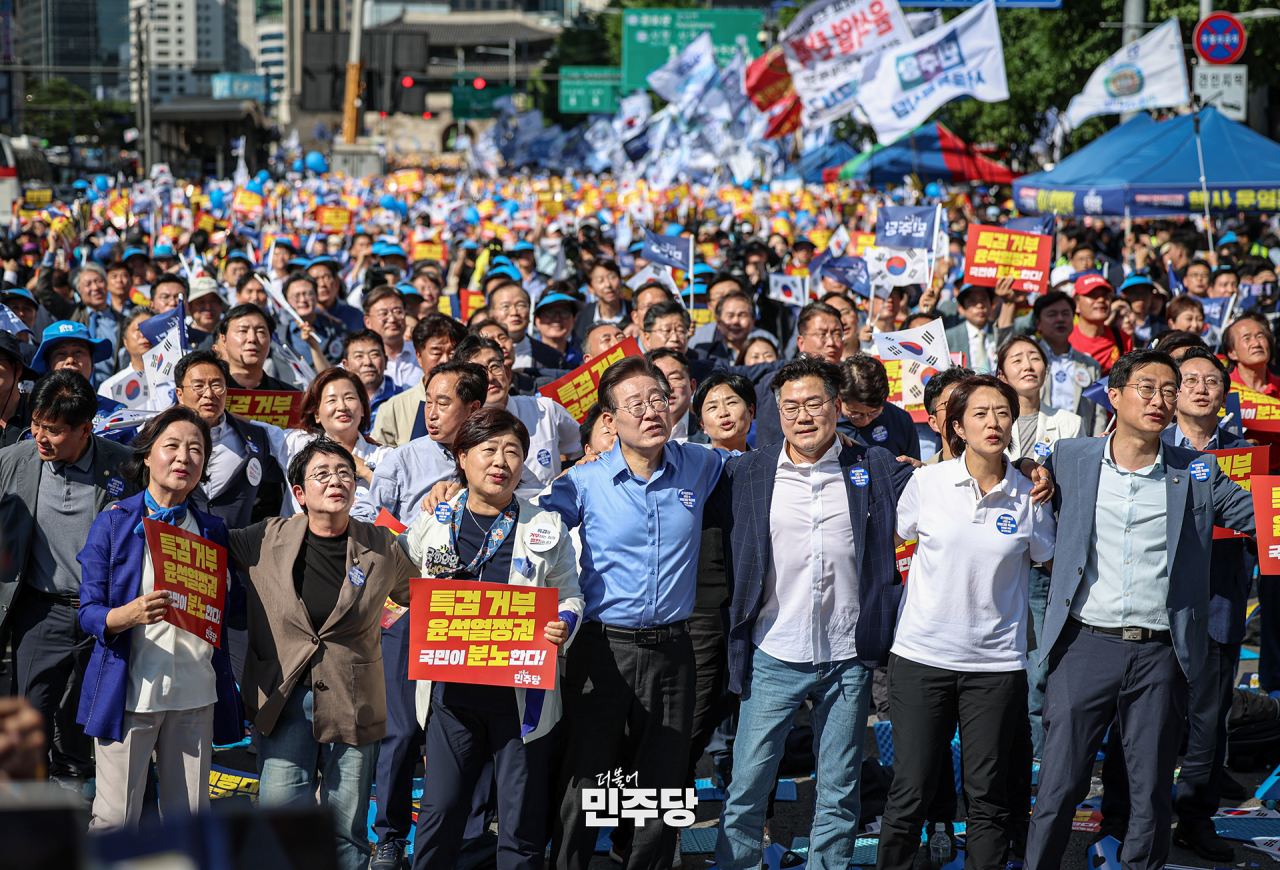 이재명 당대표 및 지도부가 2024.05.25.(토) 서울역 4번출구 앞에서 열린 야당·시민사회 공동해병대원특검법 거부 규탄 및 통과 촉구 범국민대회에 참석하여 규탄퍼포먼스를 하고 있다.