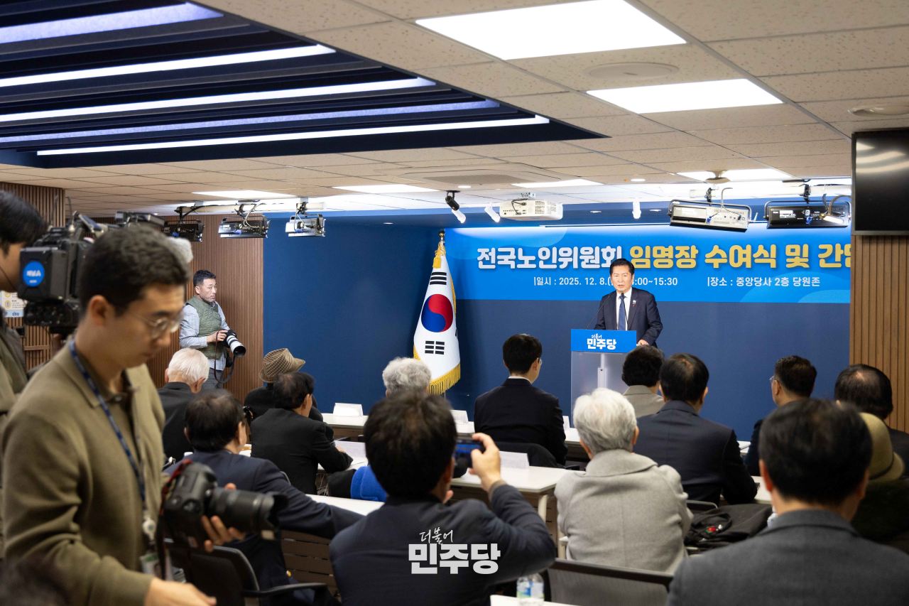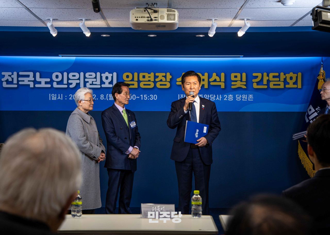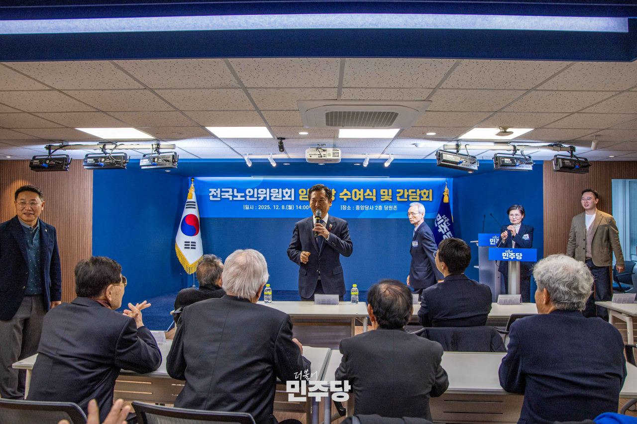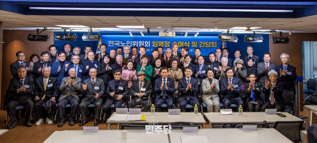 정청래 당대표가 2025.12.08.(월) 여의도에 위치한 중앙당사 2층에서 열린 전국노인위윈회 임명장 수여식에 참석하여 기념촬영을 하고 있다.