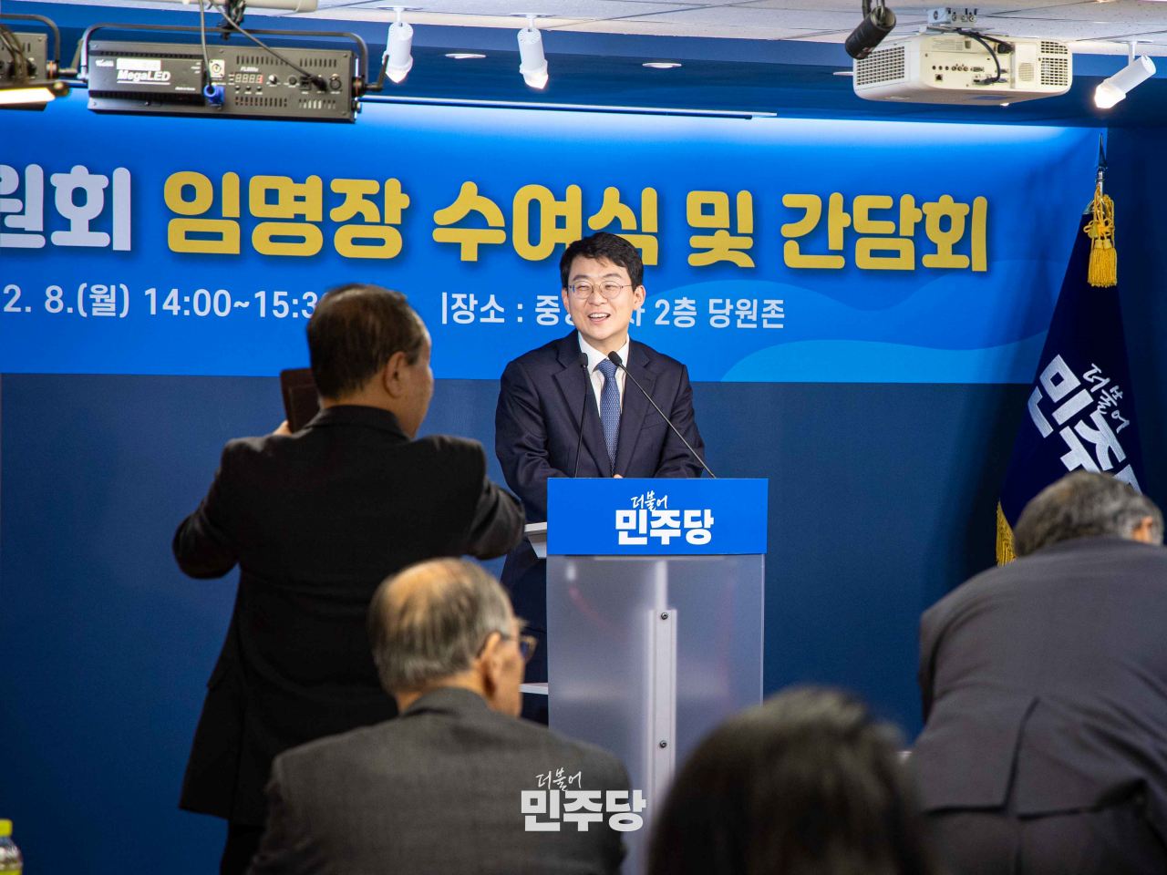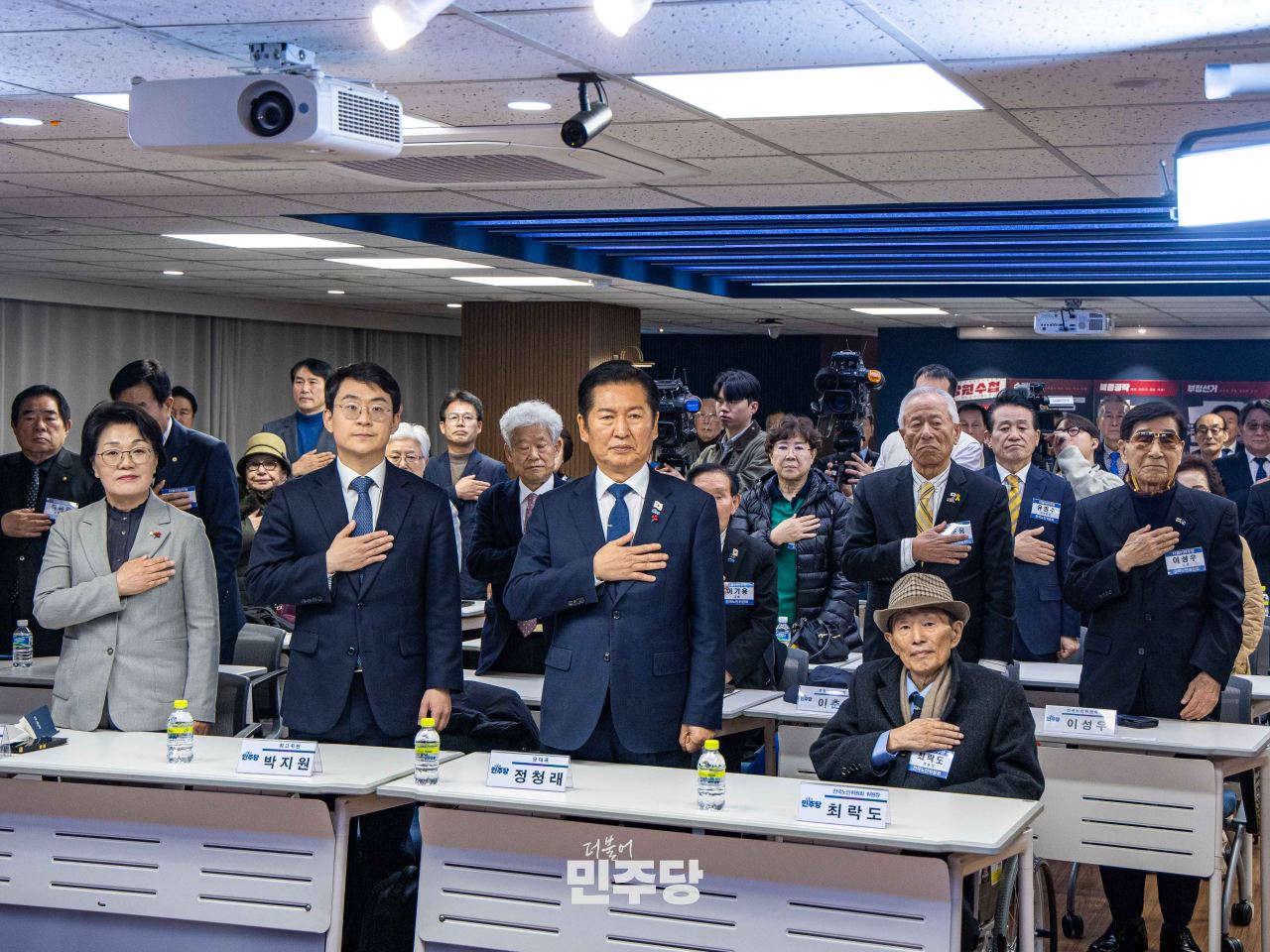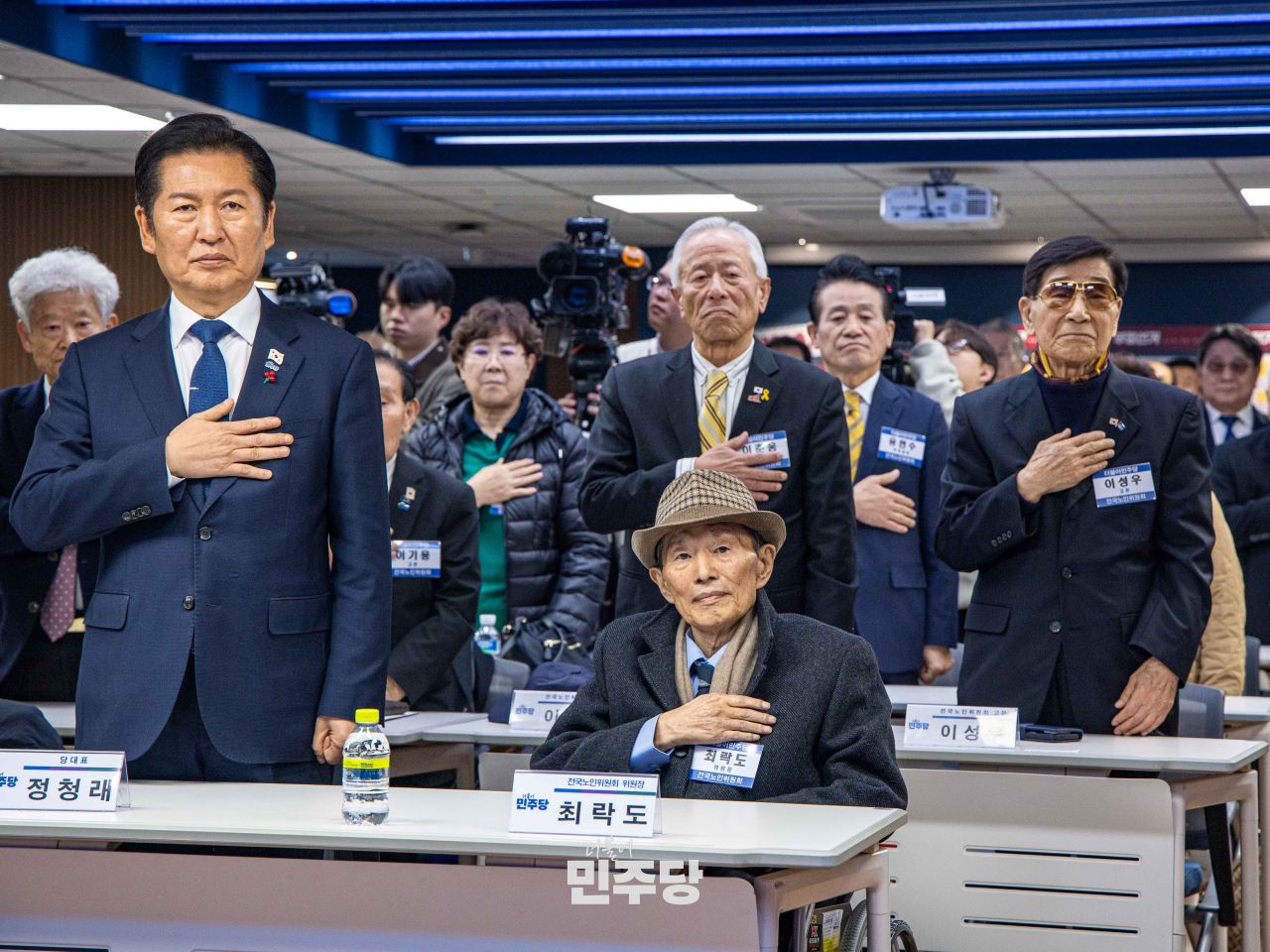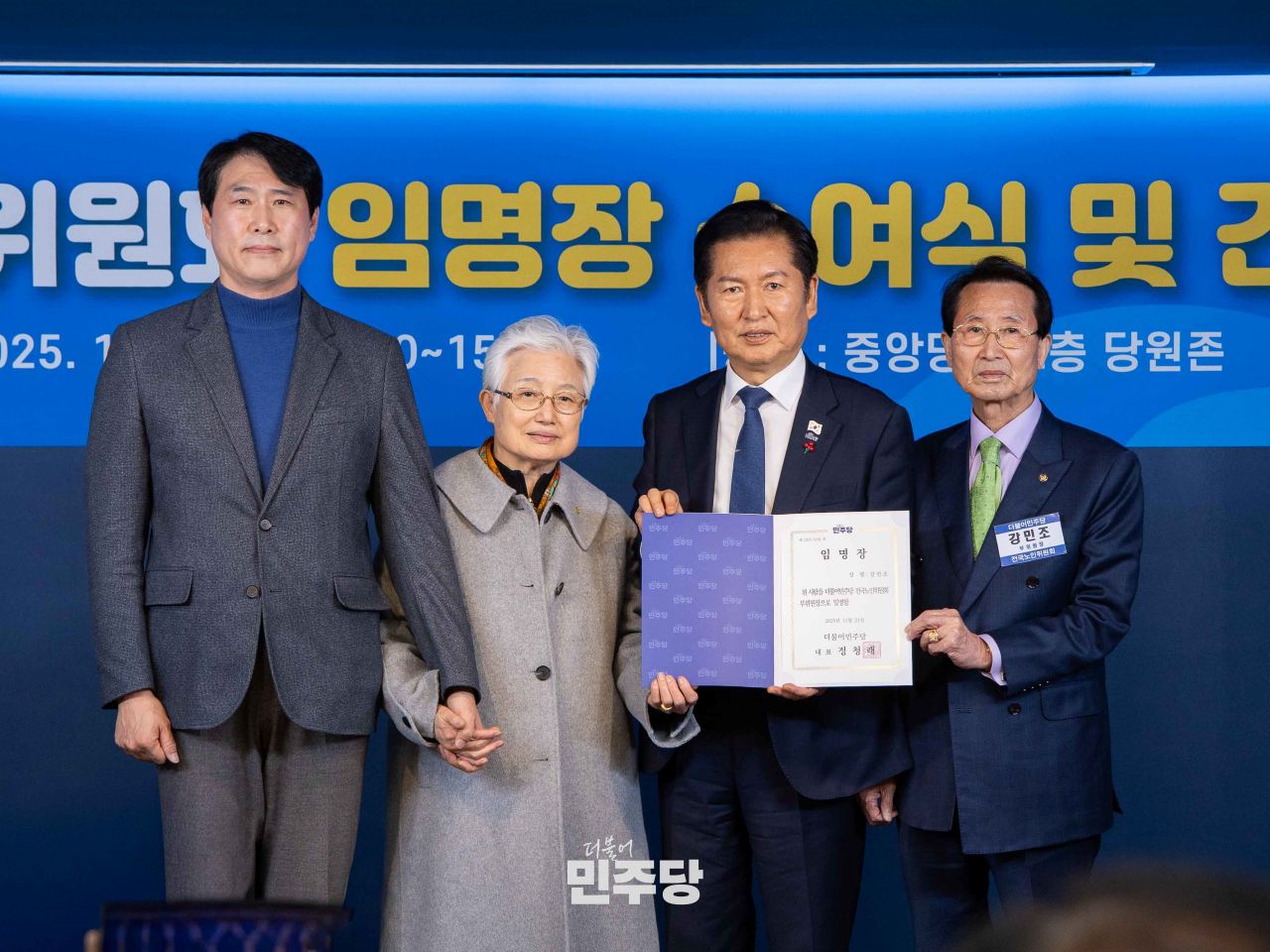 정청래 당대표가 2025.12.08.(월) 여의도에 위치한 중앙당사 2층에서 열린 전국노인위윈회 임명장 수여식에 참석하여 기념촬영을 하고 있다.