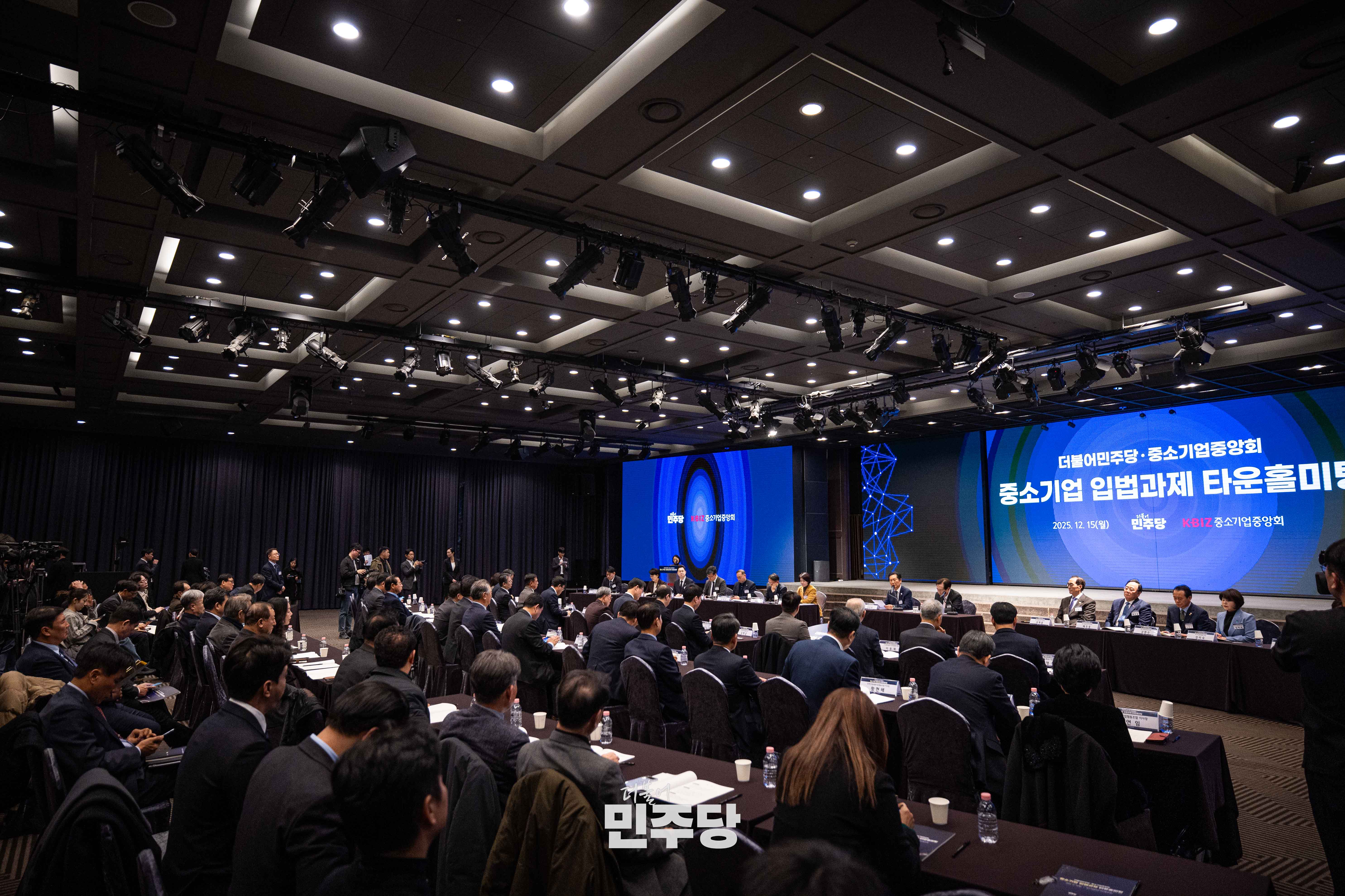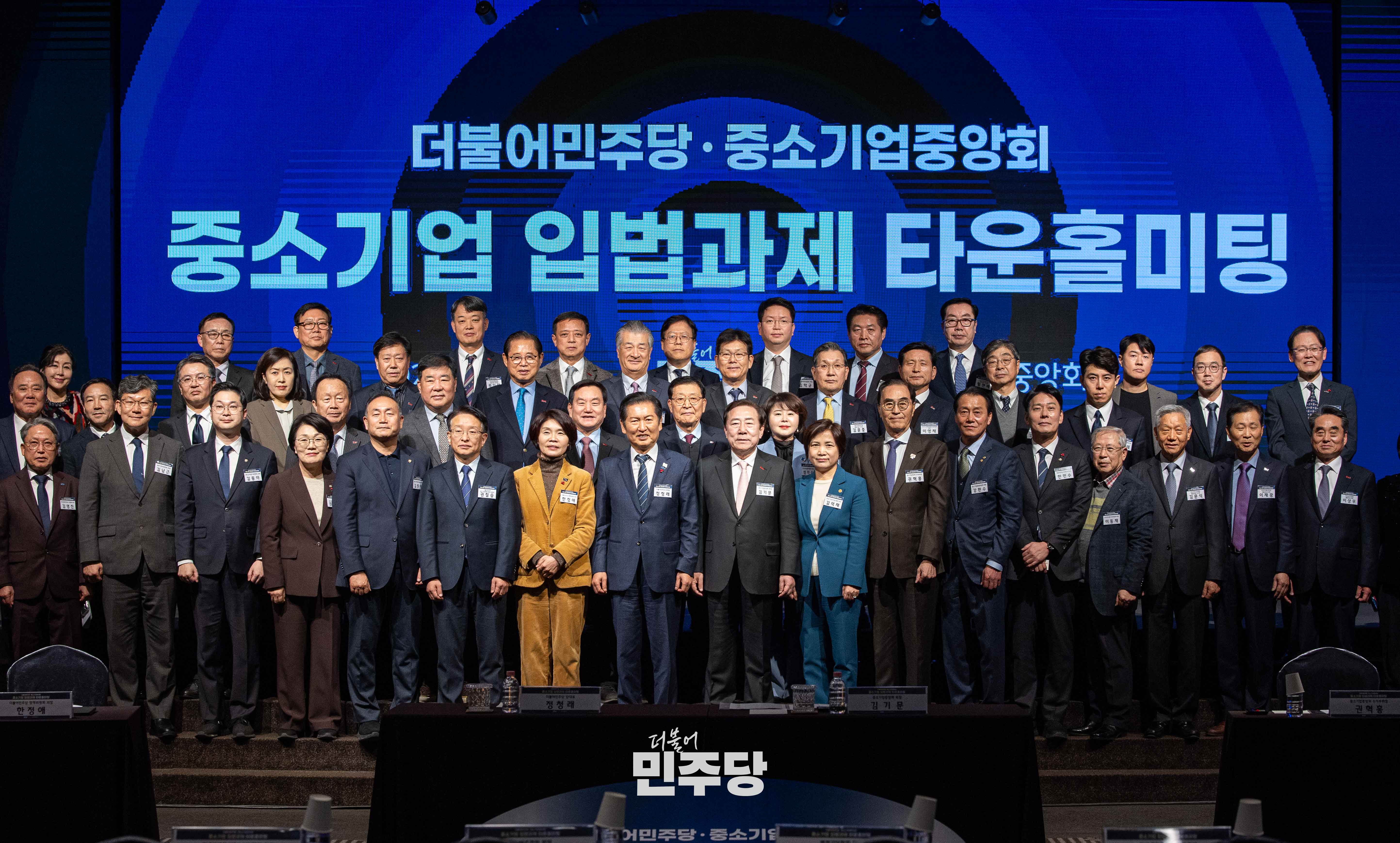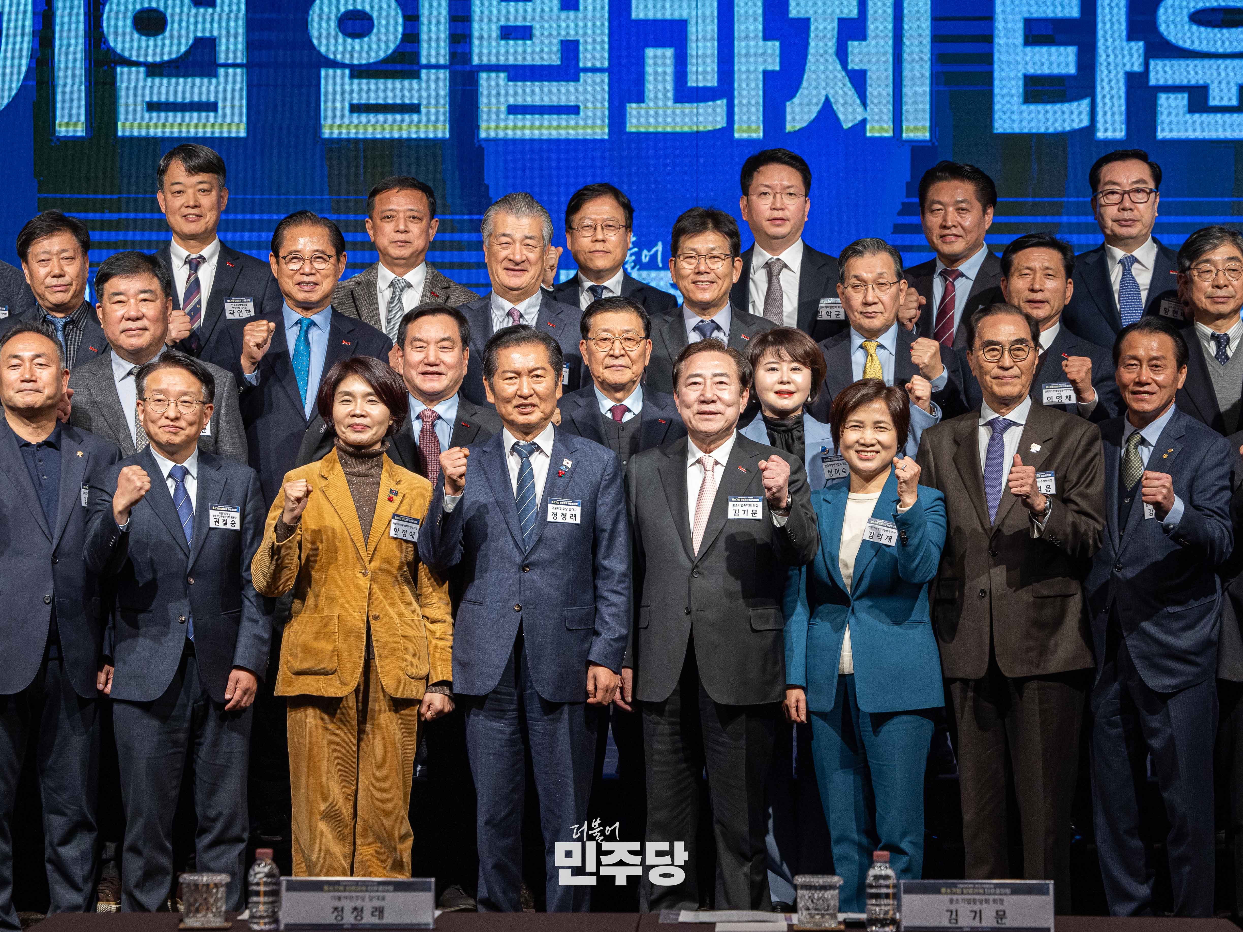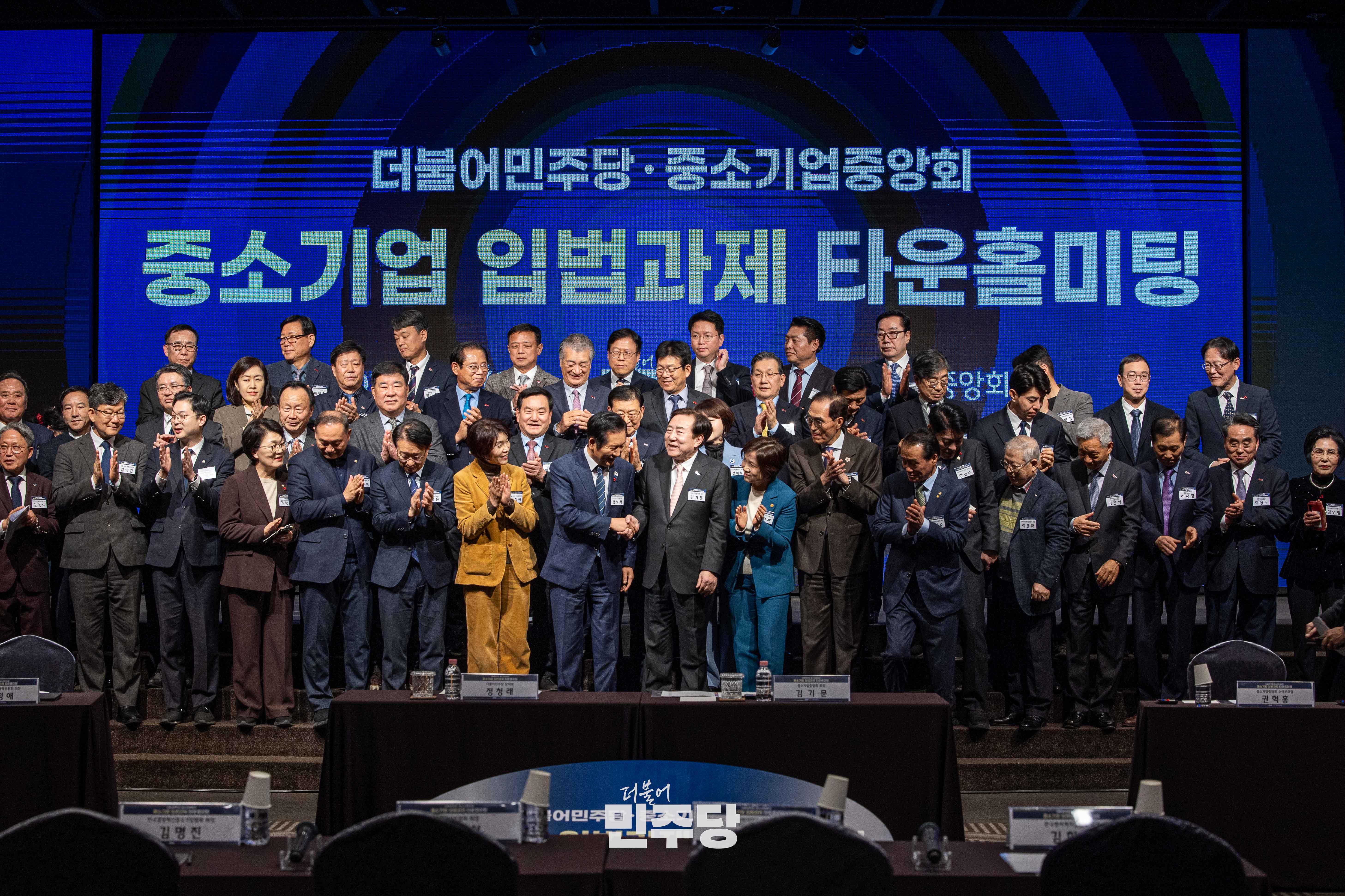 정청래 당대표가 2025.12.15.(월) 영등포구 여의도에 위치한 중소기업중앙회에서 열린 중소기업중앙회 중소기업 입법과제 타운홀미팅에 참석하여 참석자들과 기념촬영을 하고 있다.
