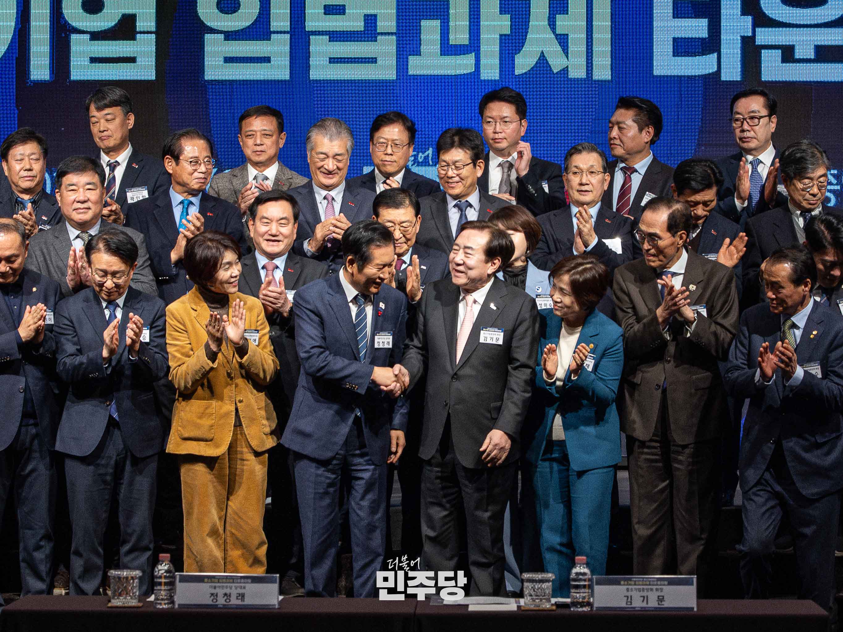 정청래 당대표가 2025.12.22.(화) 여의도 켄싱턴호텔에서 열린 참좋은지방정부협의회 하반기 정기총회에 참석하여 기념촬영을 하고 있다.
