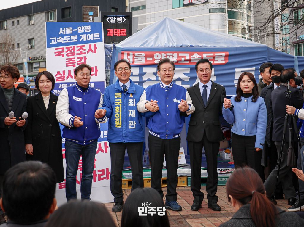 이재명 당대표가 2024.03.07.(목) 경기도 양평군청 앞 농성천막에 방문하여 경기 여주시양평군 최재관 후보 지지방문 및 양평고속도로 특혜의혹 규탄 기자회견을 하고 있다.