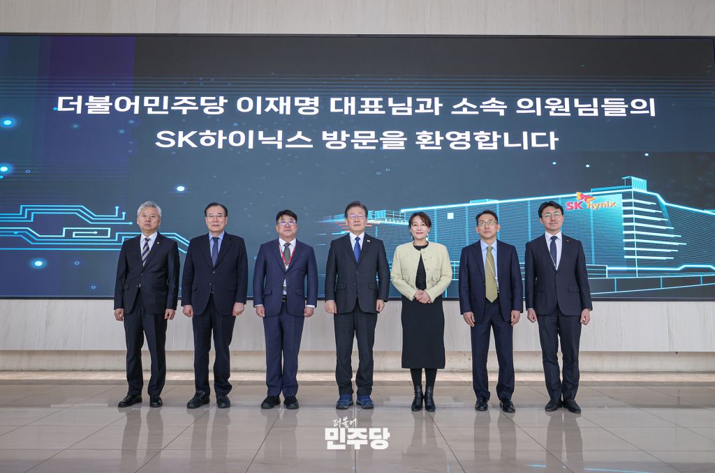 이재명 당대표가 2024.03.07.(목) 경기 이천시에 위치한 SK하이닉스를 방문하여 김동섭 사장과 종합 반도체 강국 실현을 위한 정책간담회를 하고 있다.