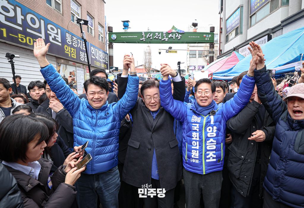 이재명 당대표가 2024.03.11.(월) 충남 홍성군에 위치한 홍성시장에 방문하여 충남지역 국회의원 후보자들과 시장상인들께 인사를 드리고 있다.