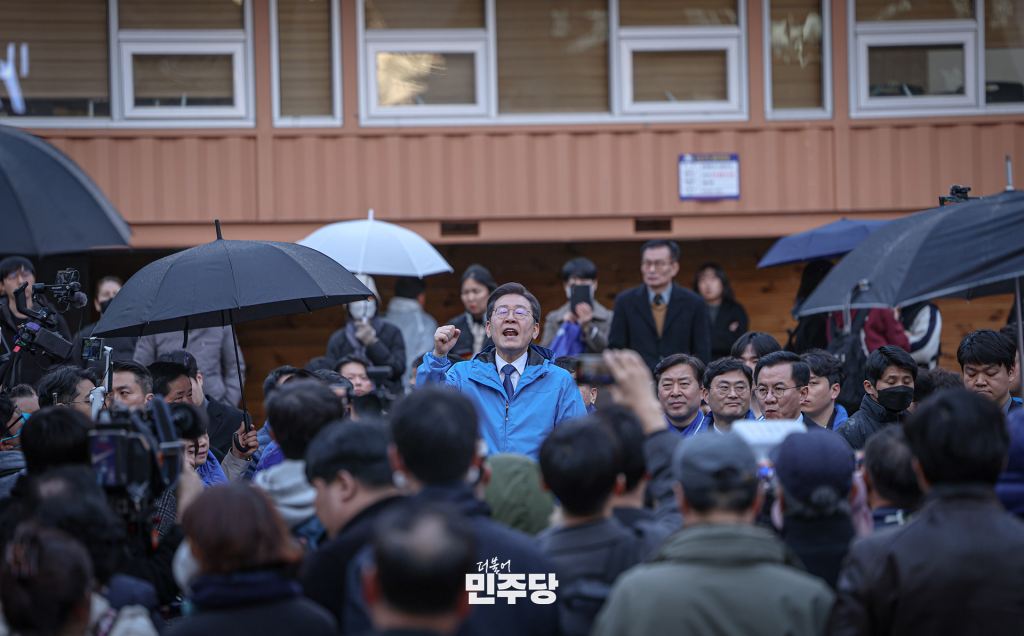이재명 당대표가 2024.03.11.(월) 충남 천안시 신부동에서 거리의 시민들에게 인사를 건네고 신부문화공원에서 현장 기자회견을 하고 있다.