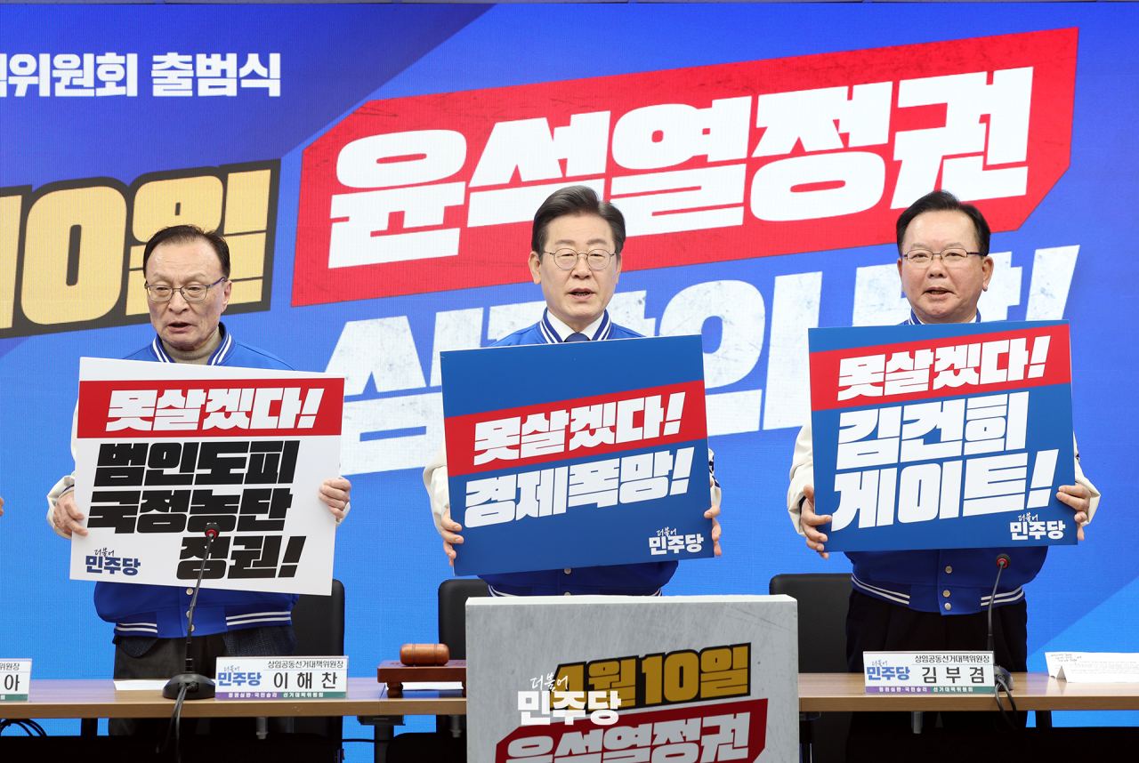 이재명, 이해찬, 김부겸 상임공동선거대책위원장이 2024.03.12.(화) 더불어민주당 중앙당사에서 열린 더불어민주당 선거대책위원회 출범식 및 1차 회의에 참석하여 모두발언을 하고 있다.