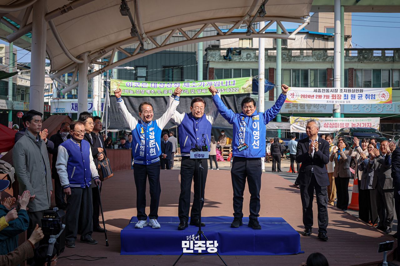 이재명, 이해찬 상임선대위원장이 2024.03.14.(목) 세종시 조치원읍에 위치한 세종전통시장에 방문하여 세종 민생현장 방문 및 세종 현장 기자회견을 하고 있다.