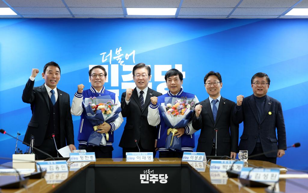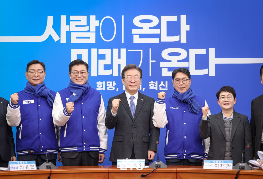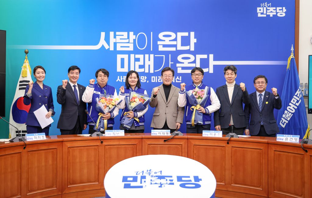 이재명 당대표가 2024.02.07.(금) 국회 본청 당대표회의실에서 열린 인재영입식에 참석하여 이 날 영입된 청년일자리 전문가 신용한, 행정전문가 이재관, 사회혁신가 김제선과 기념촬영을 하고 있다.
