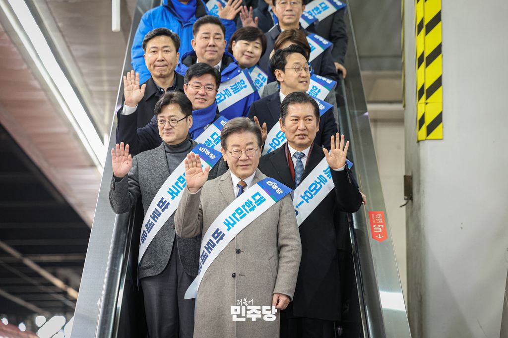 이재명 당대표 및 지도부가 2024.02.08.(목) 서울 용산역에서 국민들께 설 귀성 인사를 드리고 있다.