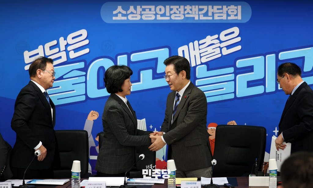 이재명 당대표가 2024.02.14.(수) 여의도에 위치한 소상공인연합회에 방문하여 오세희 소상공인연합회 회장에게 소상공인연합회 정책과제를 전달받고 있다.