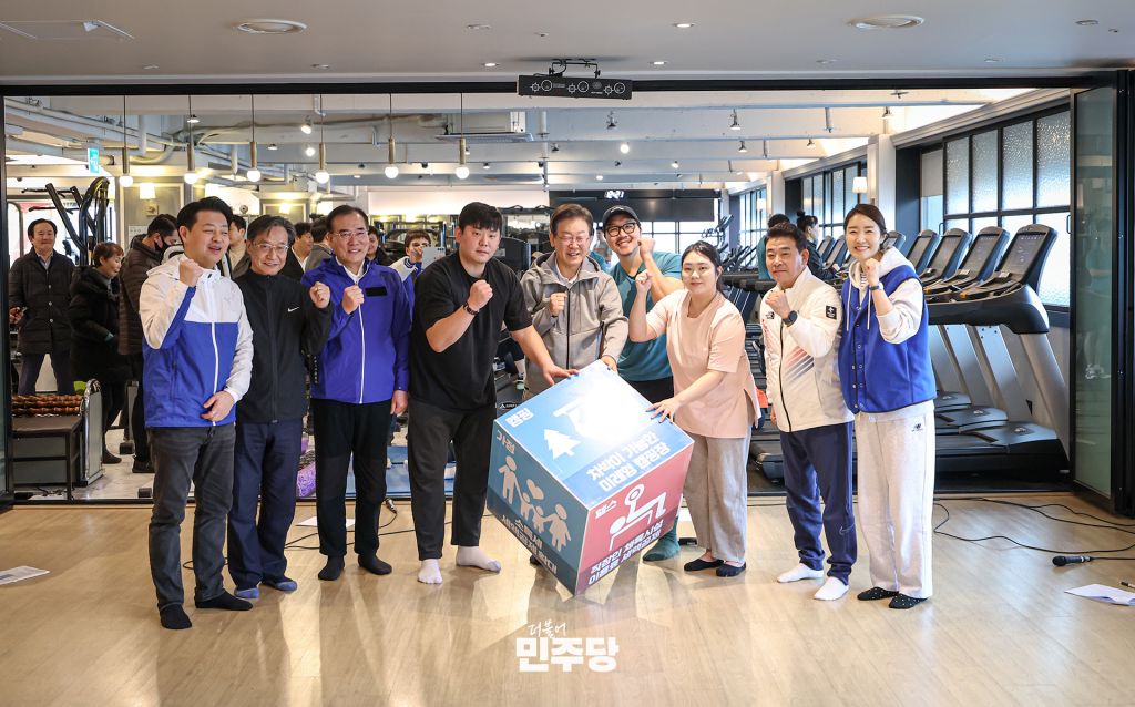이재명 당대표가 2024.02.28.(수) 서대문구 홍제동에 위치한 매직짐 휘트니스 홍제점에서 진행한 직장인 정책공약발표에 앞서 트레이너의 안내를 따라 가볍게 몸을 풀고 있다.