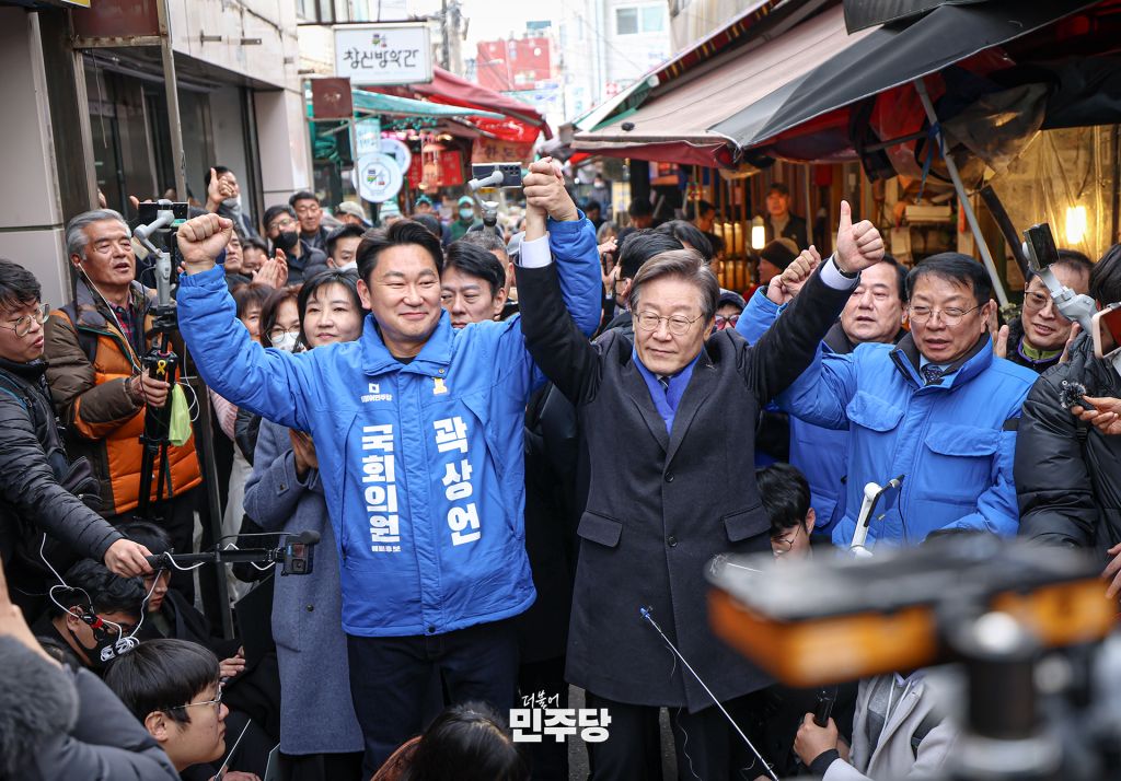 이재명 당대표가 2024.03.04.(월) 종로구에 위치한 창신시장에 곽상언 종로구 국회의원 후보와 함께 방문하여 시장상인들과 인사를 나누고 있다.