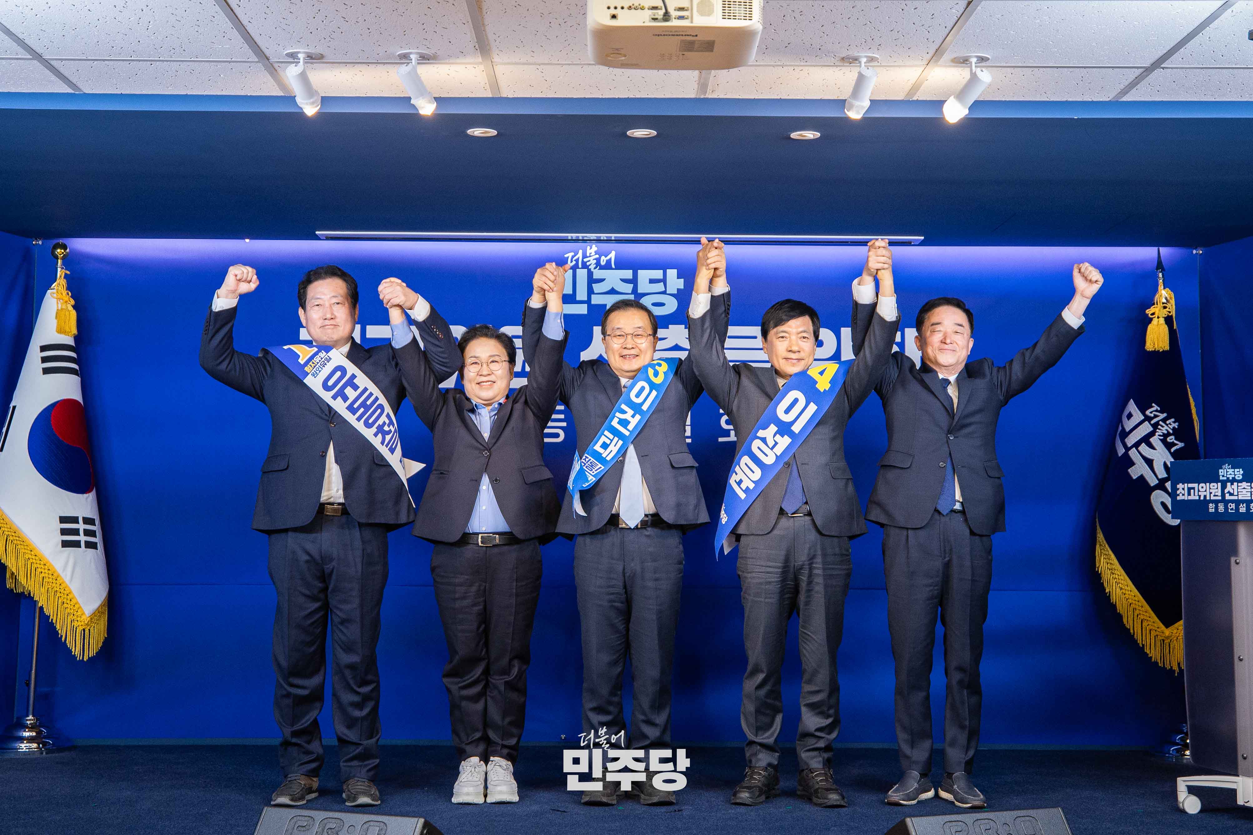 정청래 당대표가 2025.12.19.(금) 국회 본청 당대표회의실에서 열린 공명선거실천서약식에 참석하여 최고위원 보궐선거 후보자들과 기념촬영을 하고 있다.