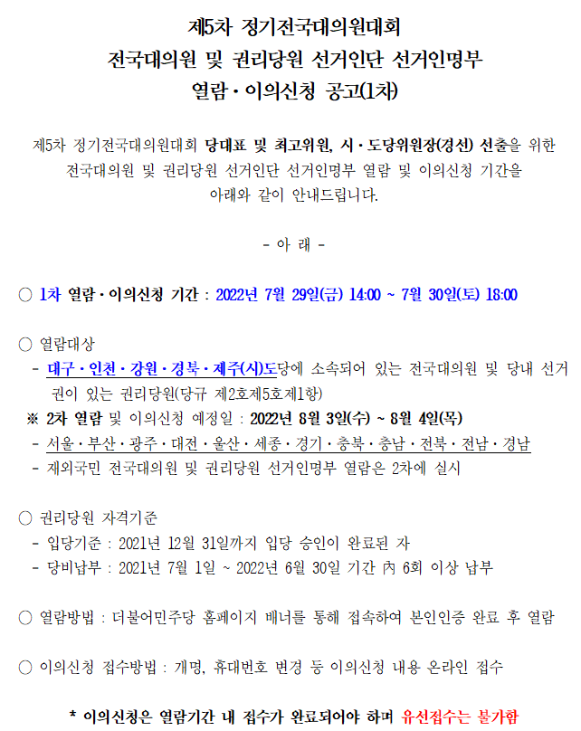 제5차 정기전국대의원대회 선거인명부 열람 및 이의신청 공고(1차)