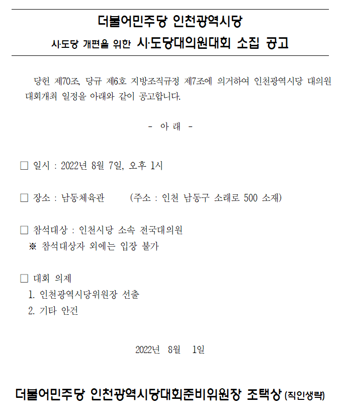 더불어민주당 인천광역시당 시‧도당대의원대회 소집 공고