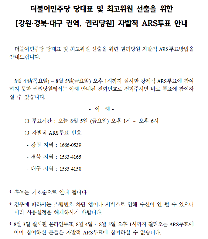 더불어민주당 당대표 및 최고위원 선출을 위한 [강원·경북·대구 권역, 권리당원] 자발적 ARS투표 안내