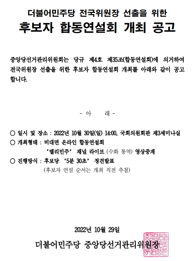 더불어민주당 전국위원장 선출을 위한 후보자 합동연설회 개최 연기 공고
