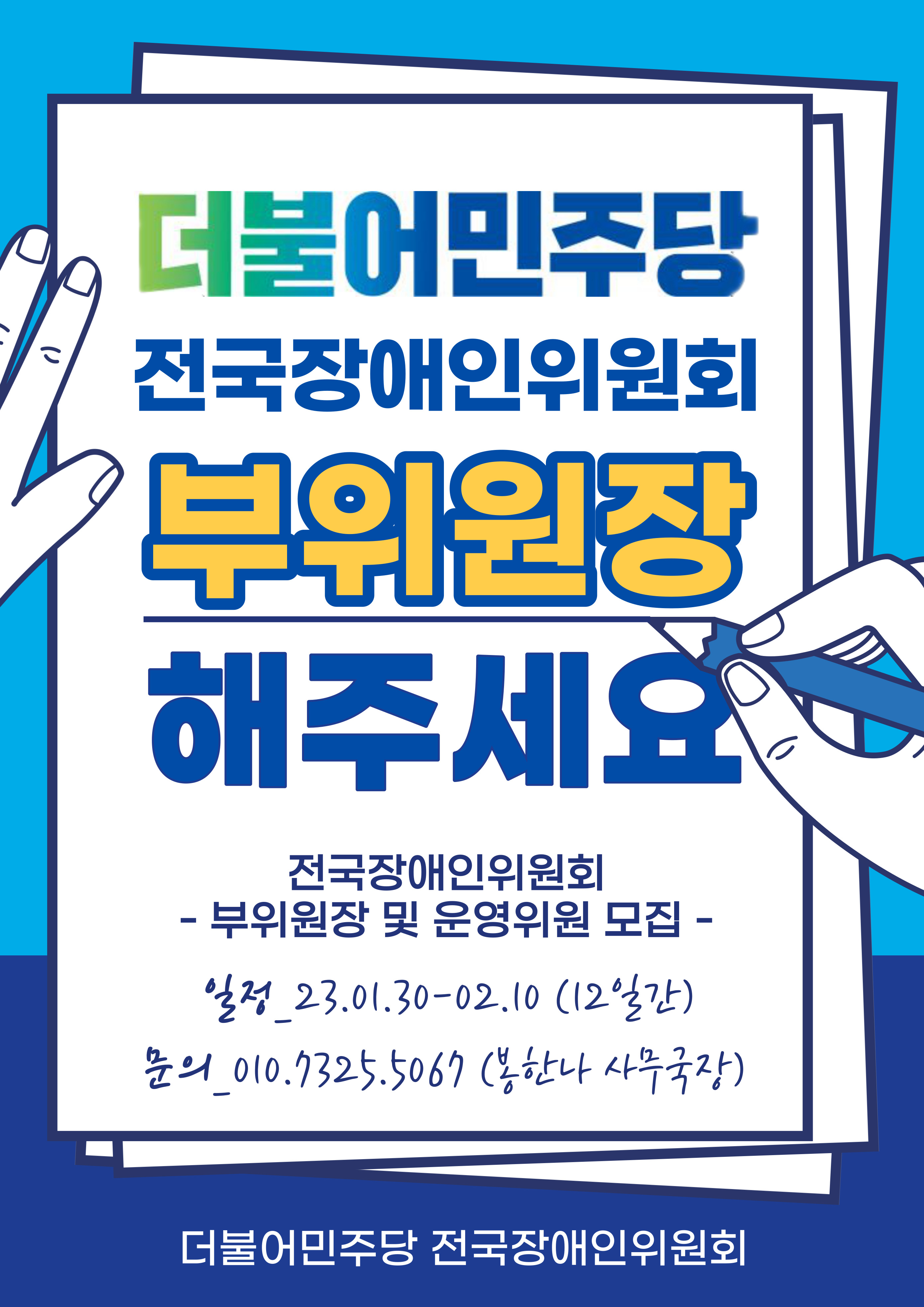 더불어민주당 전국장애인위원회에서 부위원장과 운영위원을 모집합니다.