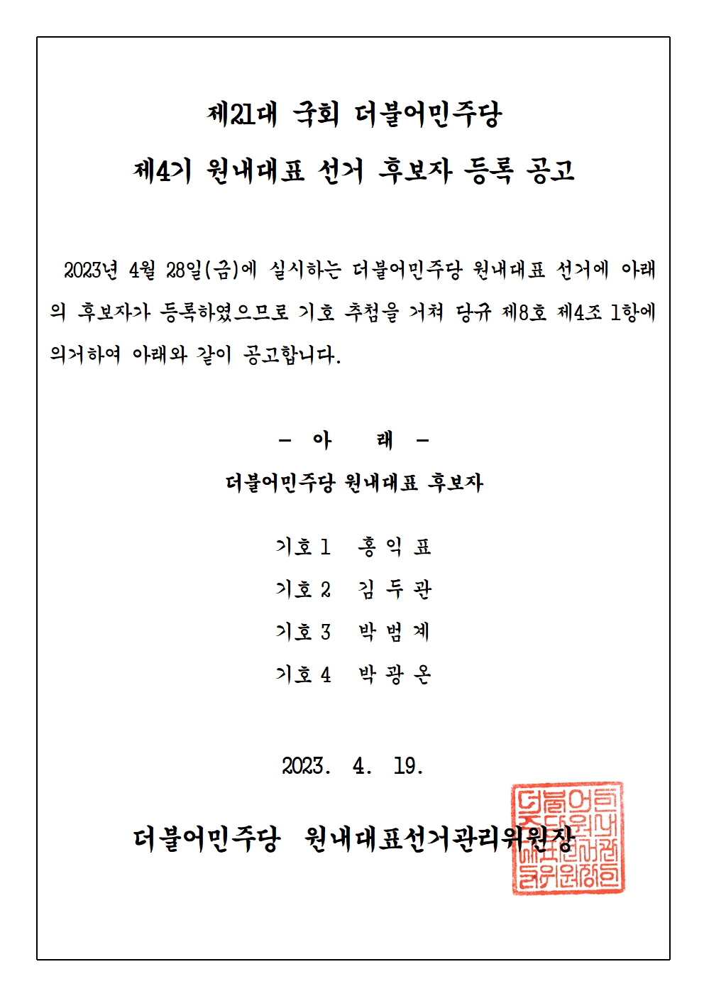 제21대 국회 더불어민주당 제4기 원내대표 선거 후보자 등록 공고