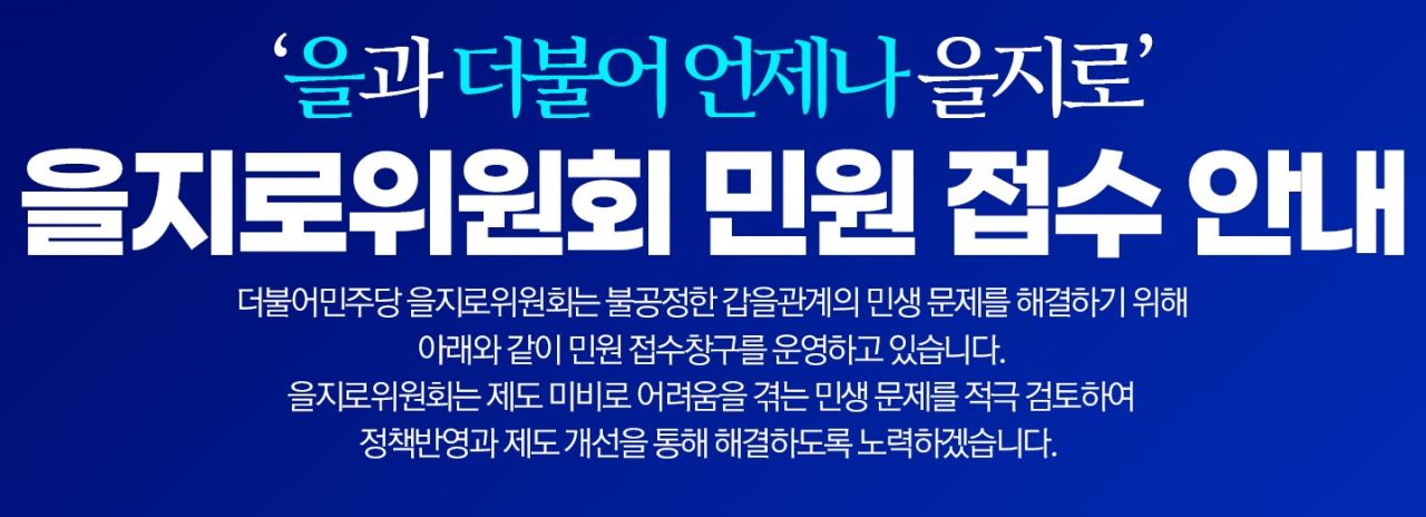 더불어민주당 을지로위원회는 불공정한 갑을관계의 민생 문제를 해결하기 위해 아래와 같이 민원 접수창구를 운영하고 있습니다.