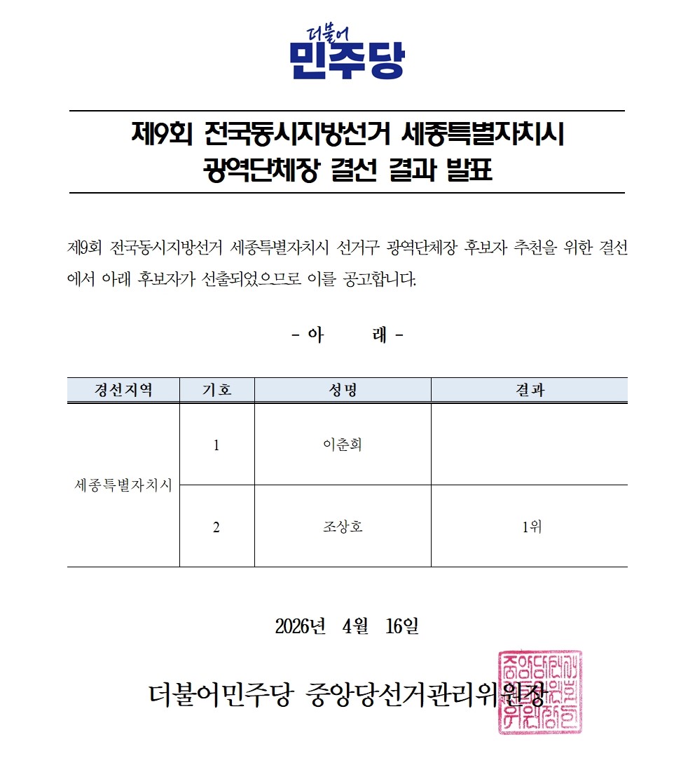 제9회 전국동시지방선거 세종특별자치시 광역단체장 결선 결과 발표