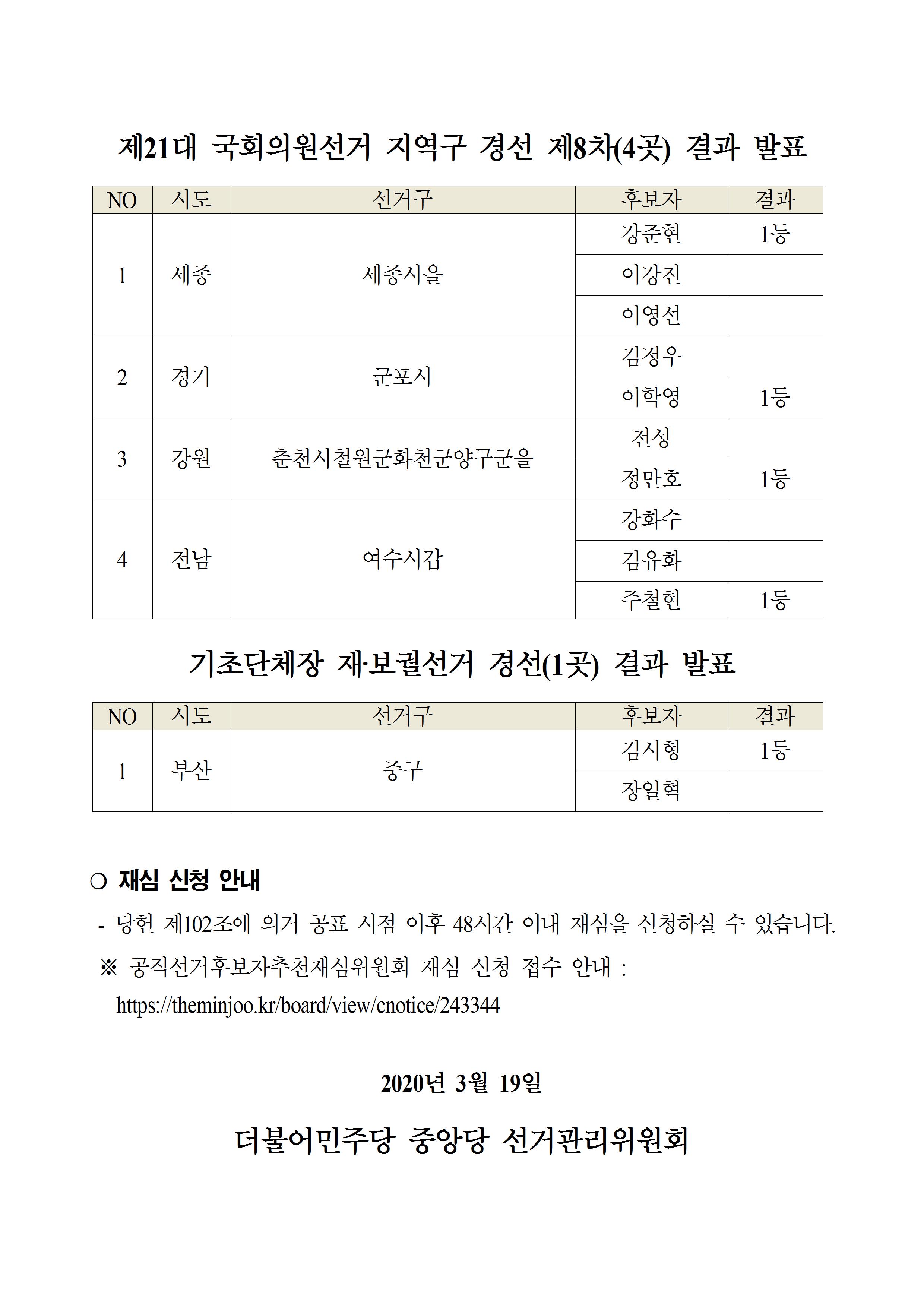 200319_8차+기초단체장_경선_결과(5곳)_제21대_국회의원선거_지역구(4)+기초단체장(1)_경선_결과.hwp