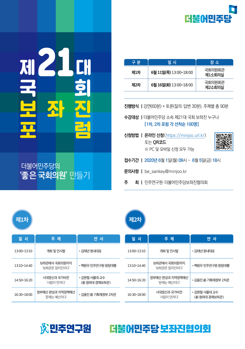 더불어민주당 민주연구원과 보좌진협의회는 우리당 소속 제21대 국회 보좌진을 대상으로 포럼을 개최합니다. 포럼은 총 2회에 걸쳐 진행되며, 각 차수별 포럼 프로그램은 동일합니다